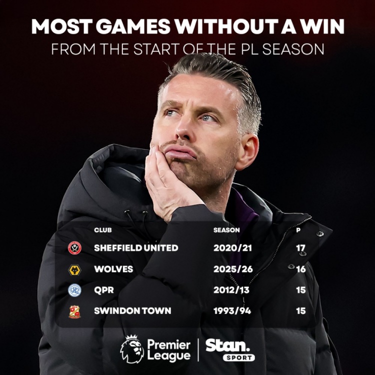据媒体统计,狼队本赛季英超前16轮比赛不胜,差1场追平谢菲联2020-2021赛季创造的英超开局连续不胜纪录。狼队下场联赛将对阵布伦特福德。