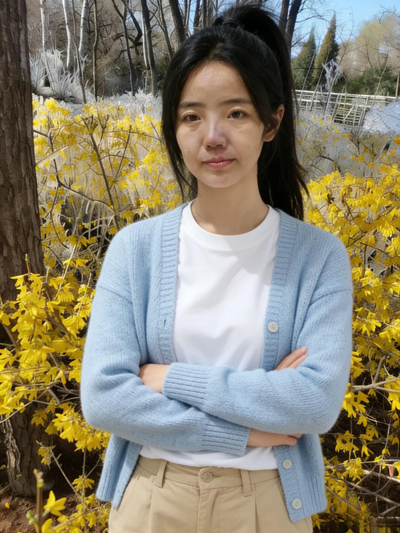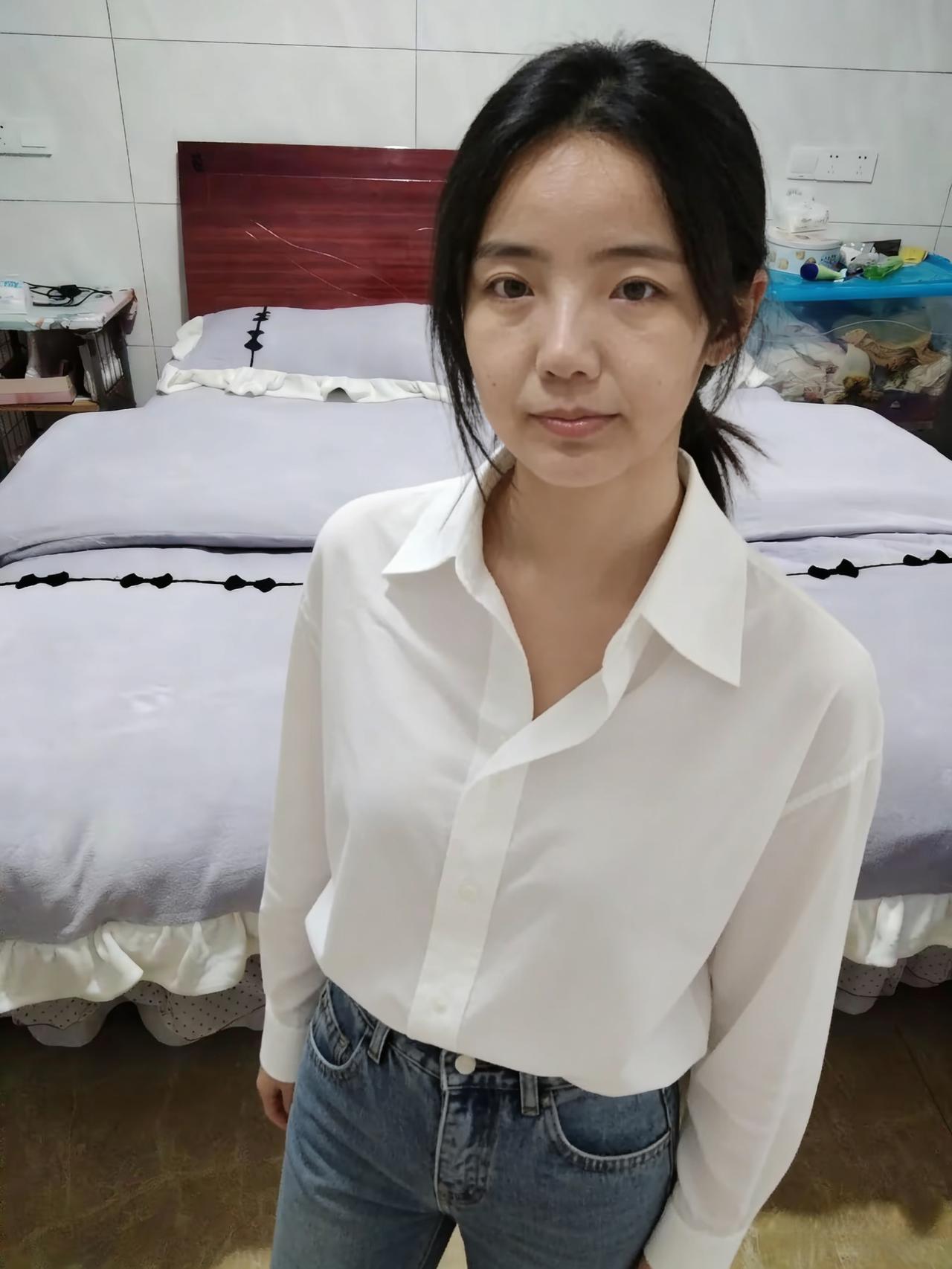 白衬衫垂着领口的弧度 在秋日的彩叶间,像一片未染霜的云 焦糖色的叶落在肩头 她站在铺满碎金的路上 牛仔裤的天蓝,撞着了枫叶的火红 ~ 转身回到房间 白衫的素净裹着卧室的慵懒 浅紫床品的纹饰里 藏着未被惊扰的晨昏 瓷砖墙的冷白,衬得她眉眼更淡 ~ 等春风漫过来时 浅蓝开衫已裹住了肩头 鹅黄的花簇在身后炸开 白T恤的圆领露着颈线 卡其裤的温暖,揉着春光的柔软 ~ 白是底色,不是边界 秋的浓烈,冬的沉静,春的鲜活 都落在衣料的纹路里 她站在不同的风景里 像纸页接住不同的墨色,却始终干净