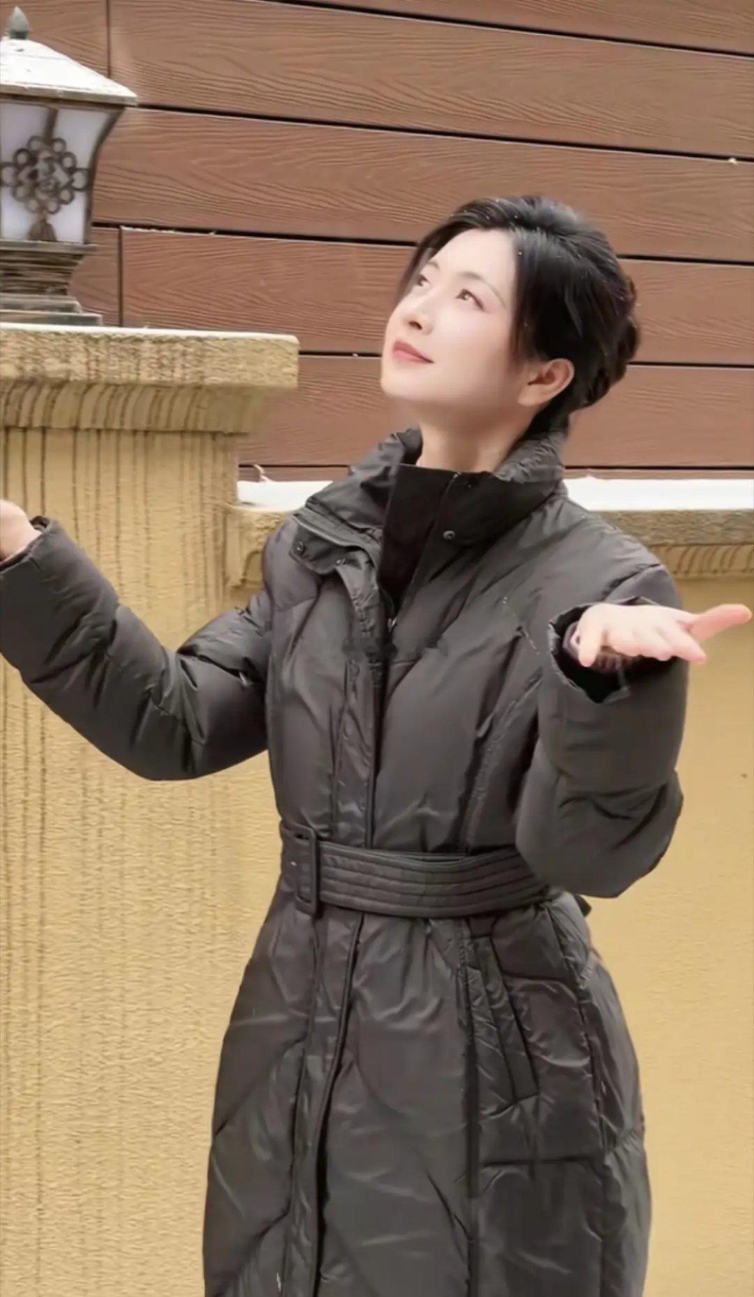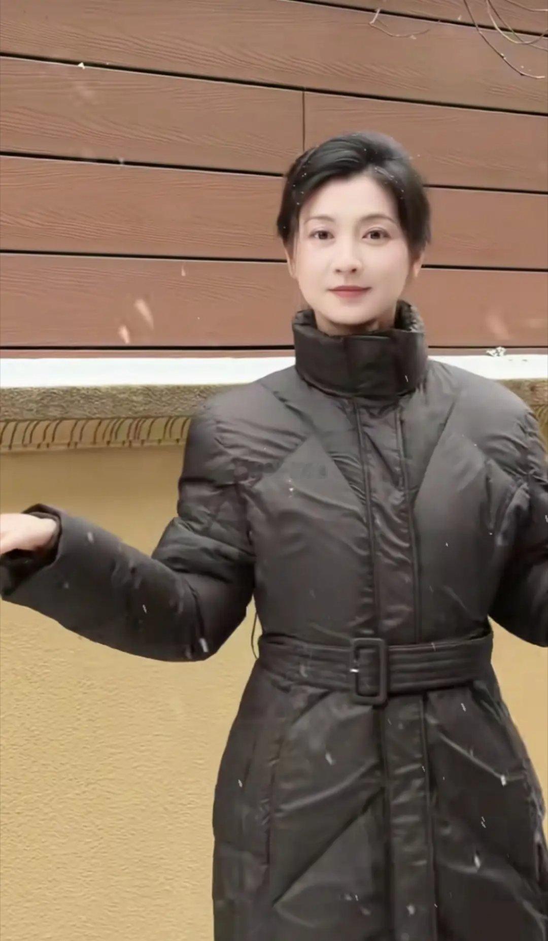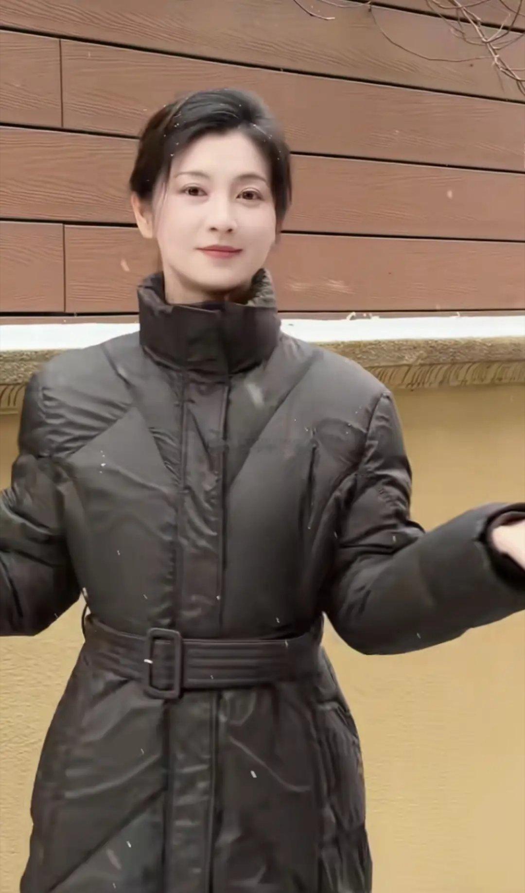 42岁斓曦身着黑色立领羽绒服现身雪地,网友发现这件羽绒服款式似是10年前的旧款,