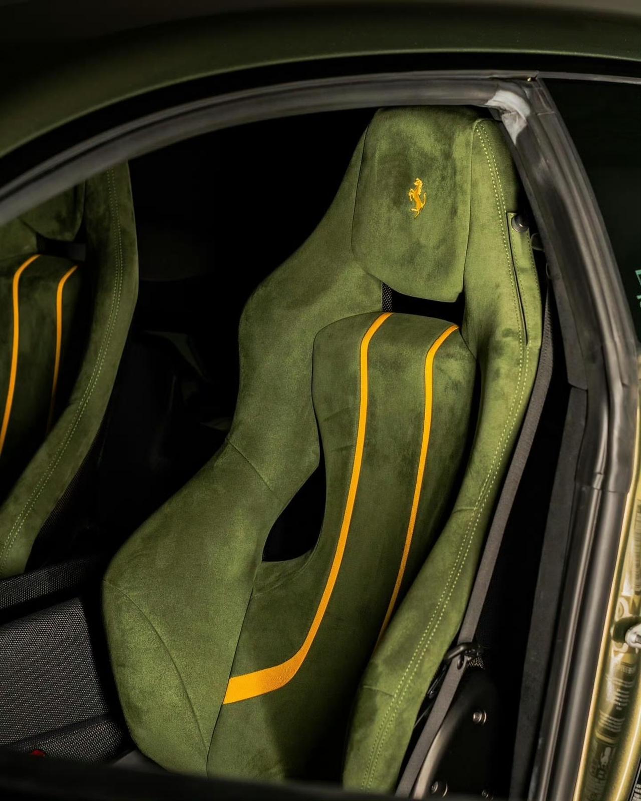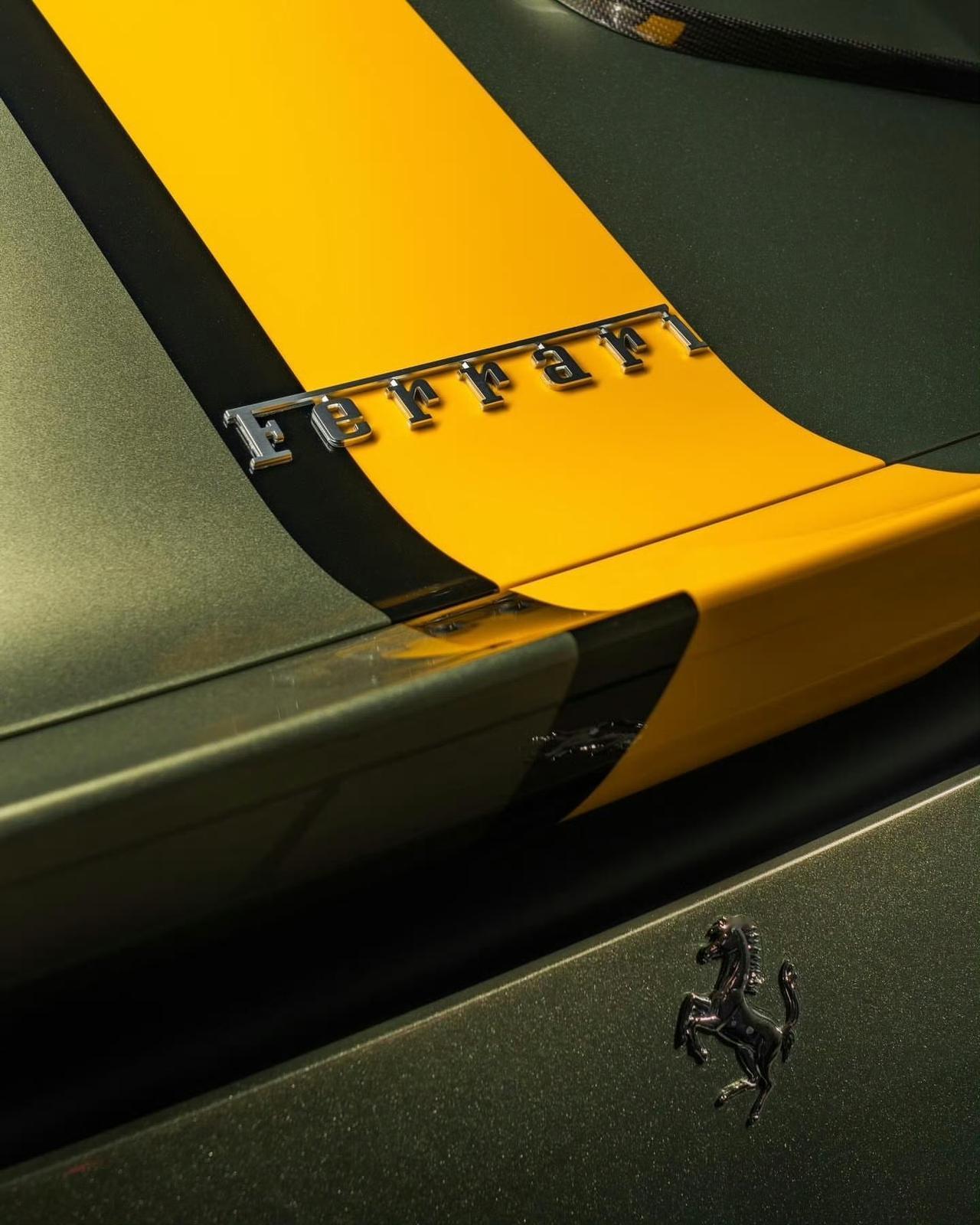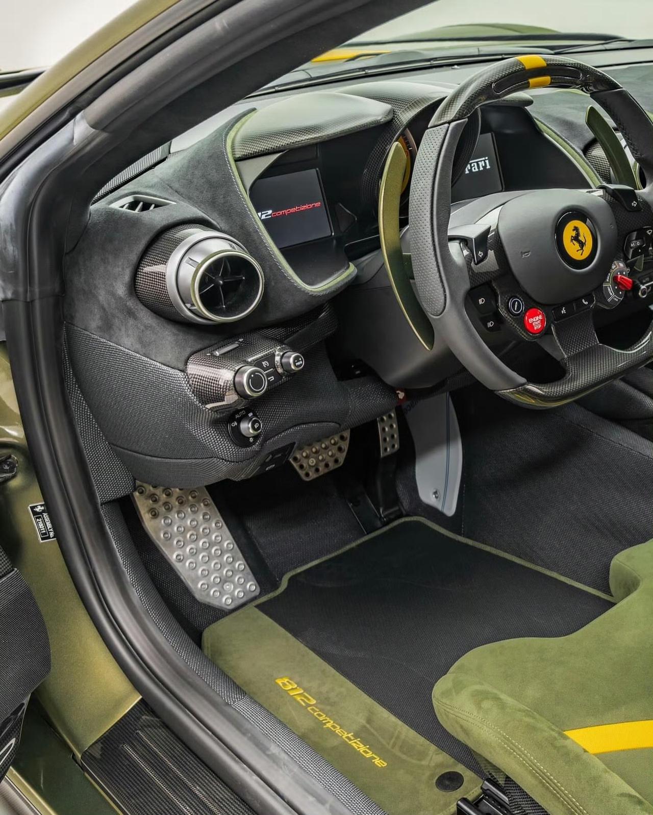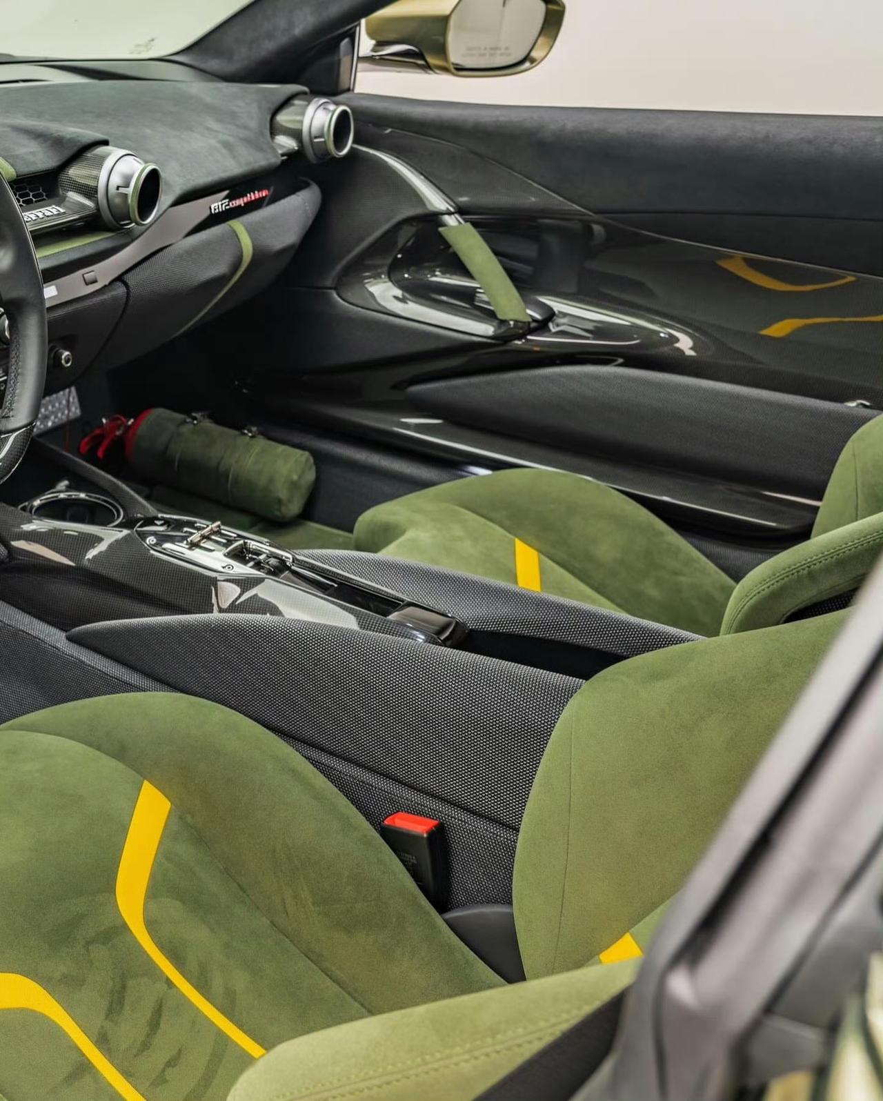 定制版812 Competizione。 这款812 Competizione采用Verde Masoni绿色车漆,搭配不对称的Giallo Fly黄色和Piano Black钢琴黑涂装,内饰为黑色Alcantara材质,配有高级Verde Alcantara碳纤维赛车座椅
