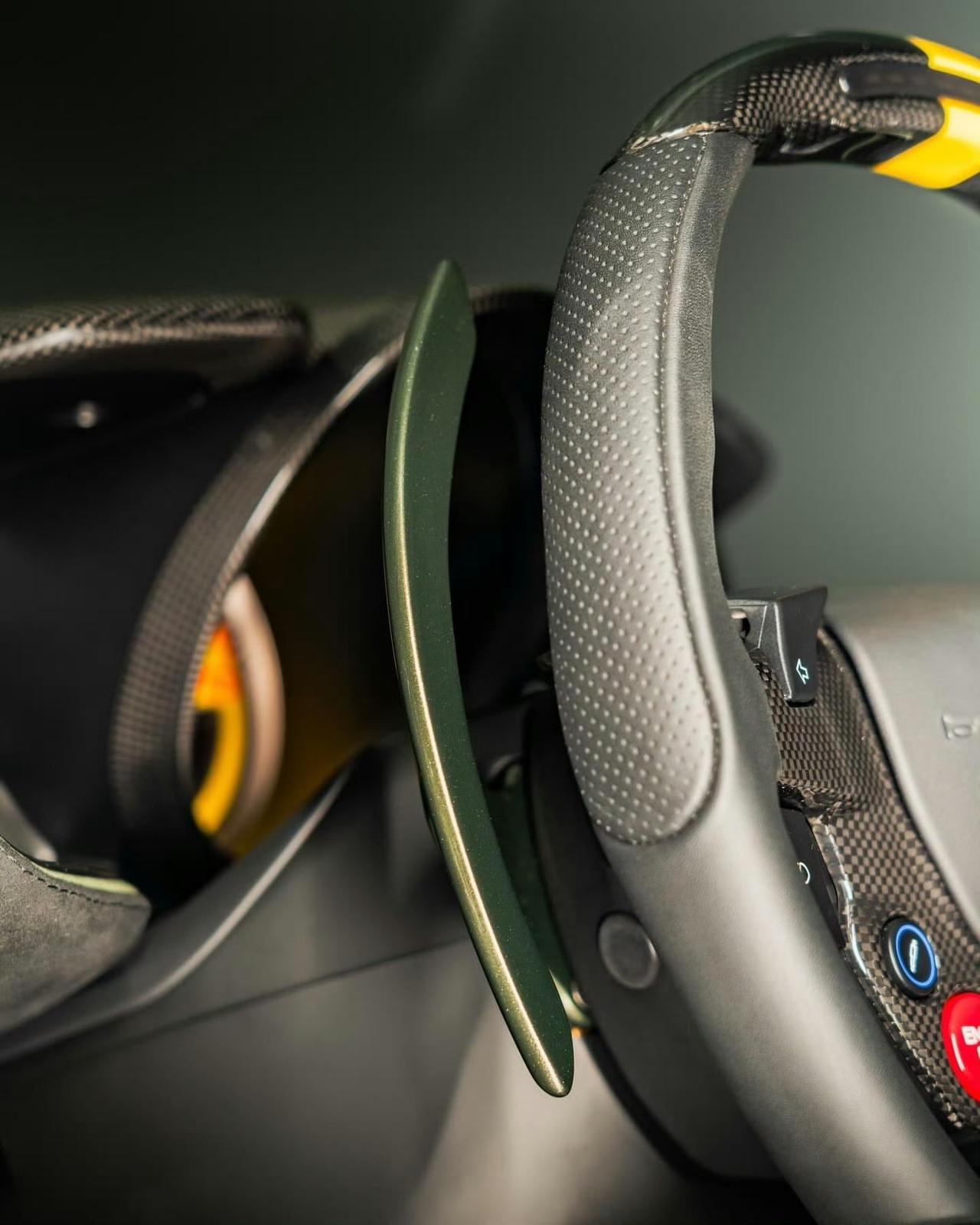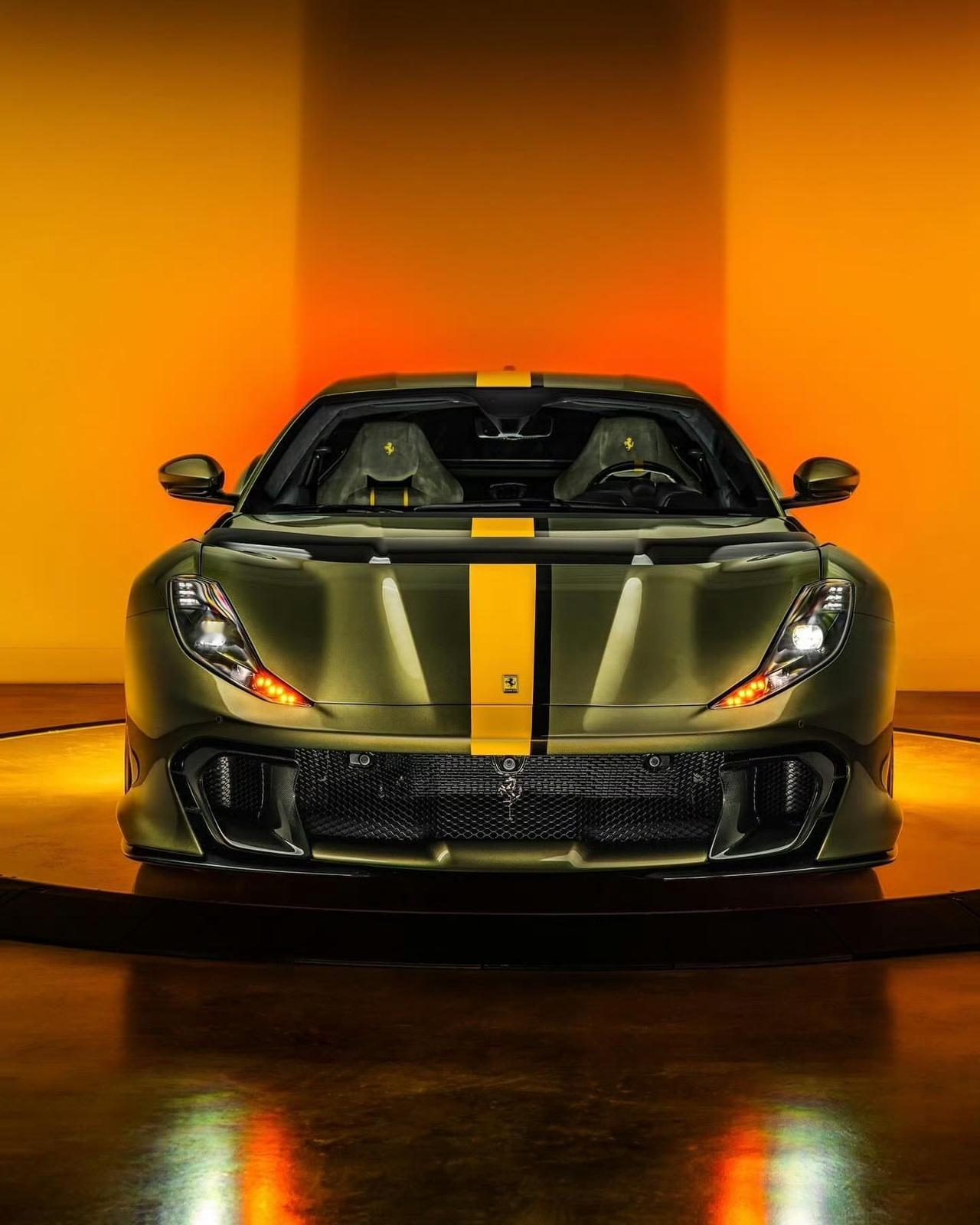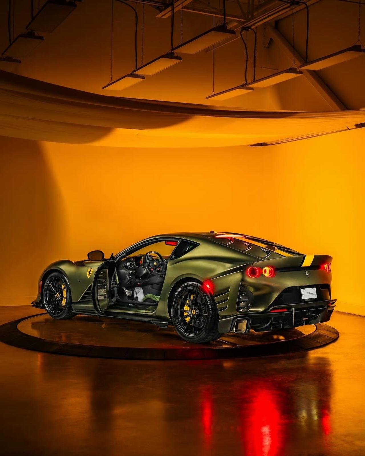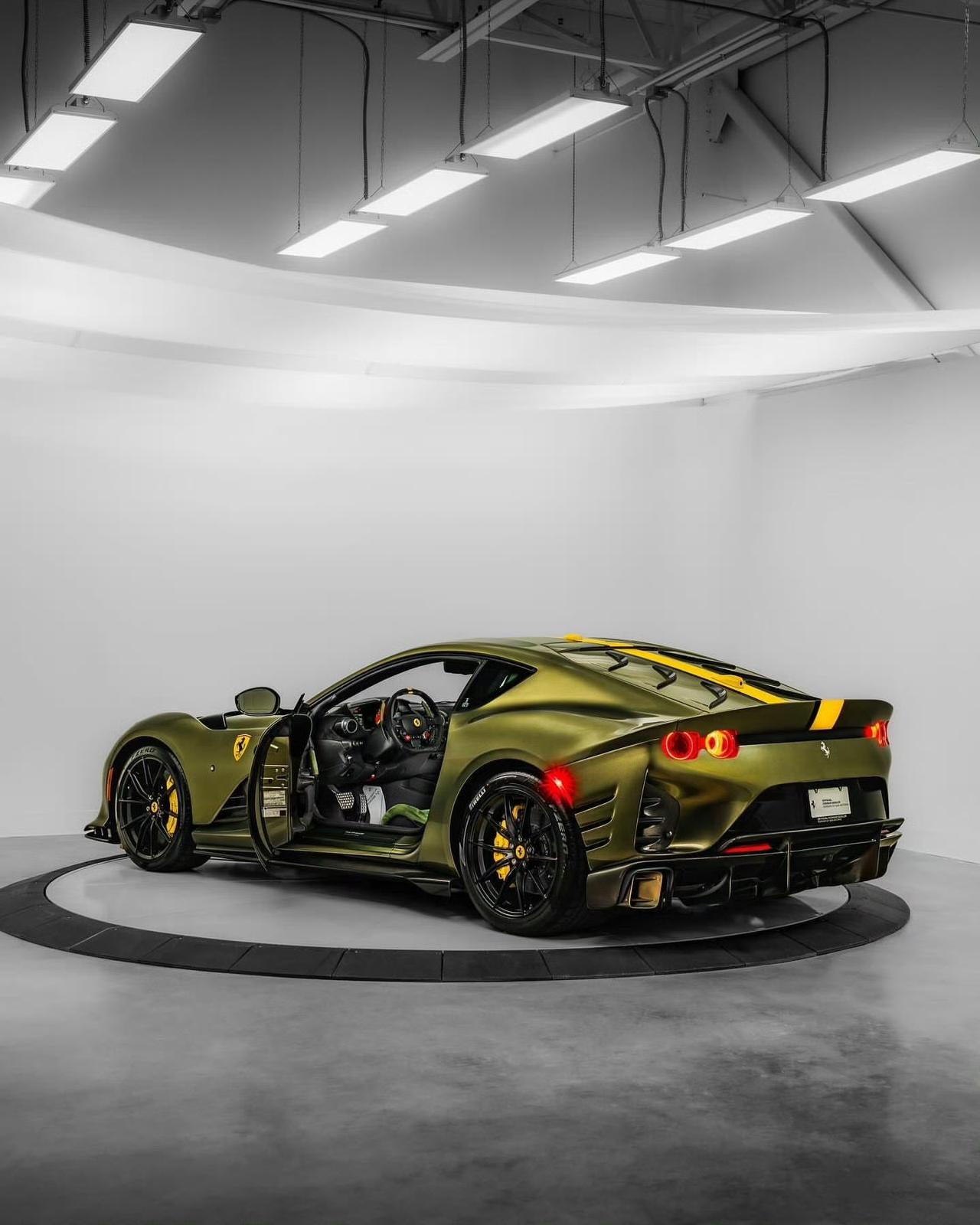 定制版812 Competizione。 这款812 Competizione采用Verde Masoni绿色车漆,搭配不对称的Giallo Fly黄色和Piano Black钢琴黑涂装,内饰为黑色Alcantara材质,配有高级Verde Alcantara碳纤维赛车座椅