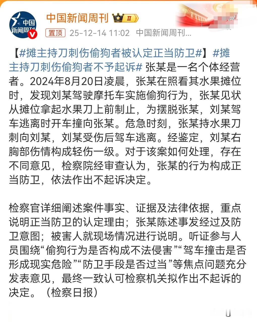 摊主持刀刺伤偷狗者被认定正当防卫。 这到底是个什么情况? 原来当时偷狗的人驾摩托车准备撞他,所以他就用刀刺了一下造成对方轻伤。 从这个细节上来看。 那绝对是正当防卫了。 这个判决非常的公正。 而且还要追究这个偷狗的责任,毕竟是个贼来的。