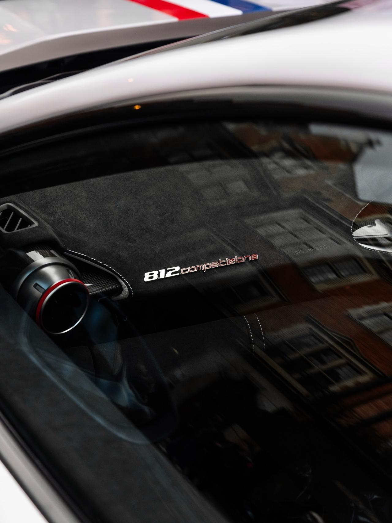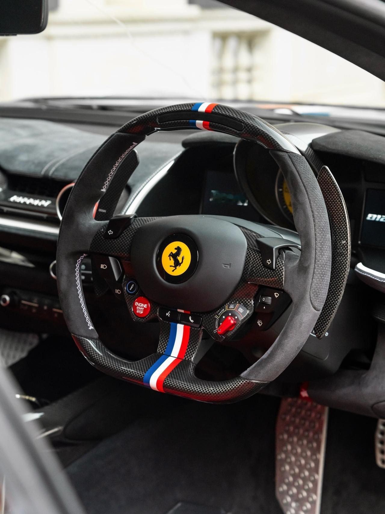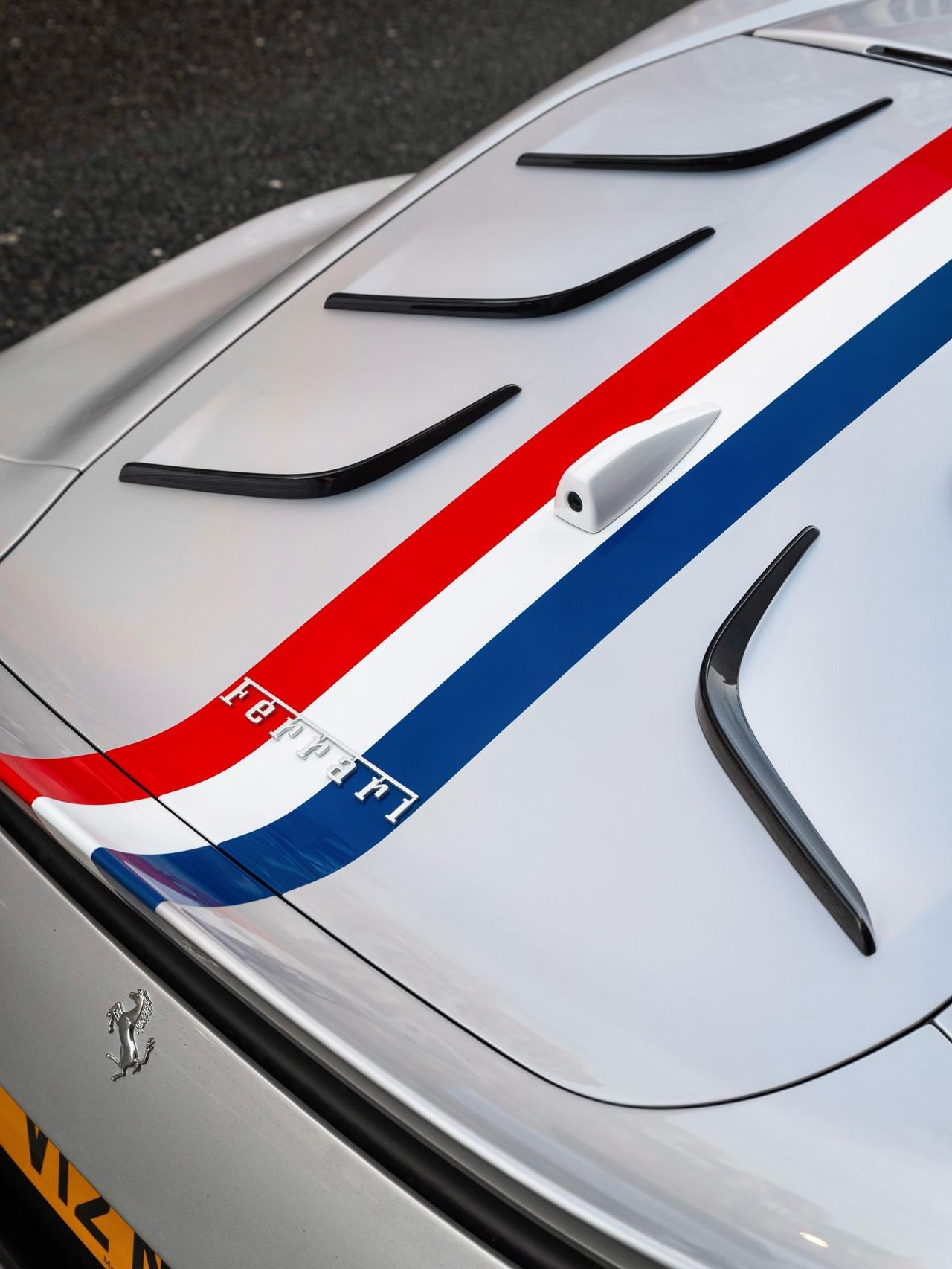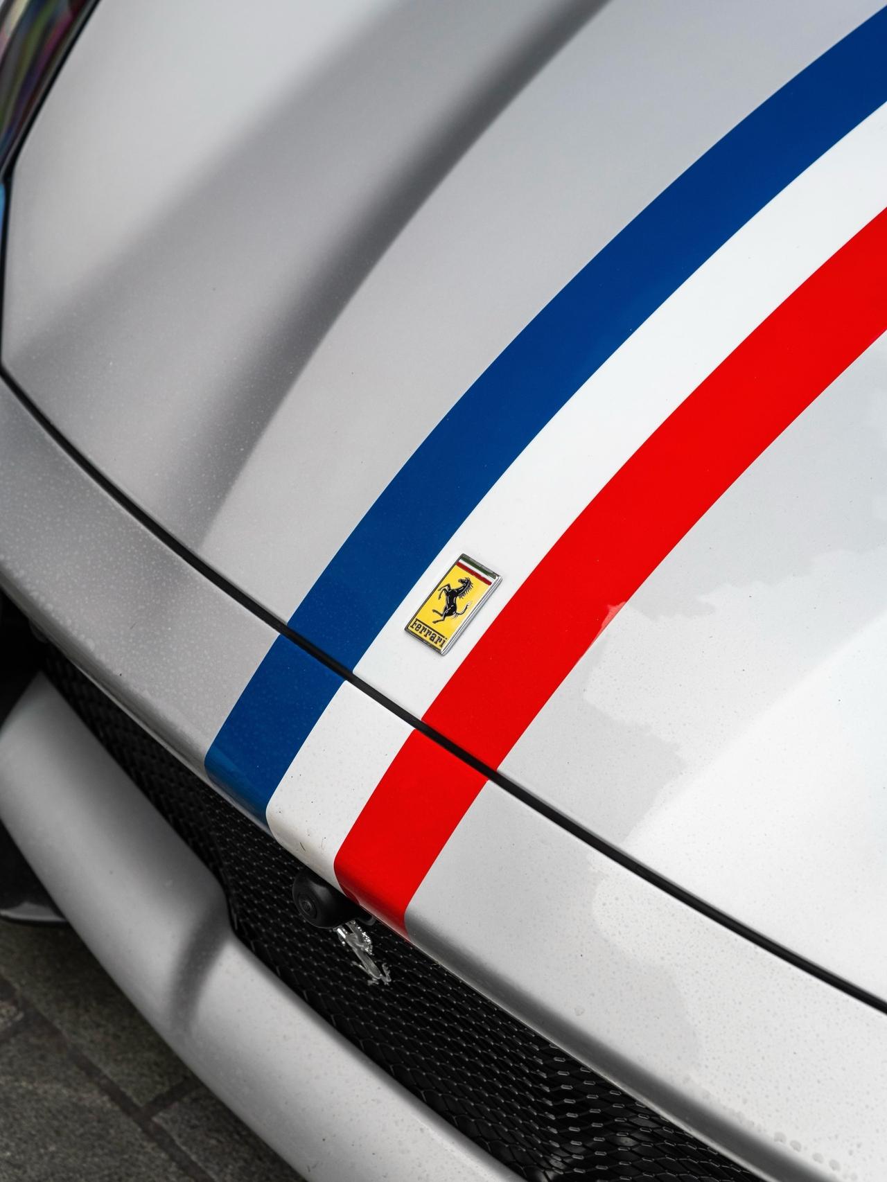 法拉利812 Competizione 图中红白蓝条纹+黄色徽标,复刻了经典车型250 GTO(底盘4153GT)的涂装;250 GTO是法拉利历史上最传奇的车型之一,收藏价值极高,此次812 Competizione的定制涂装属于向经典致敬的专属设计。