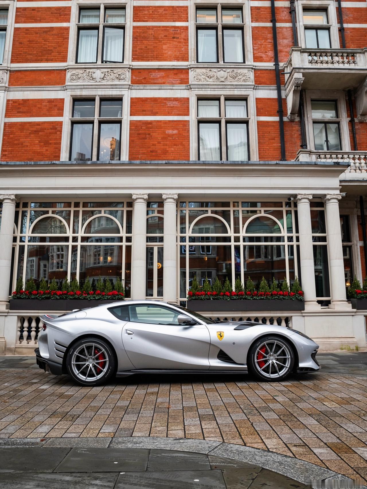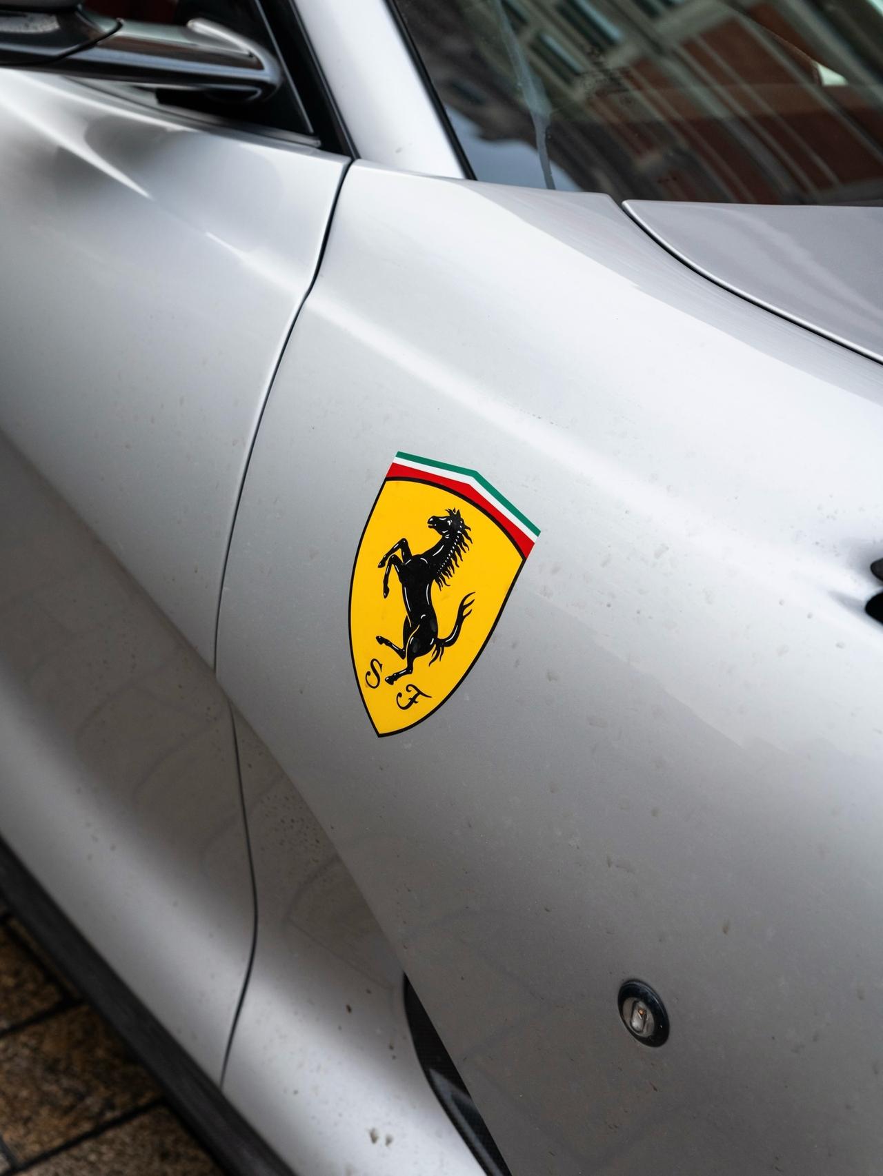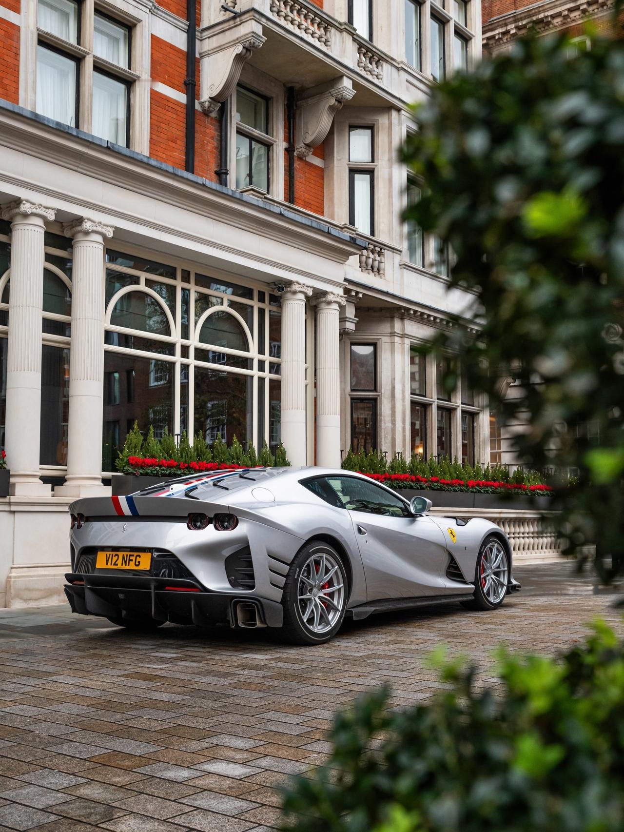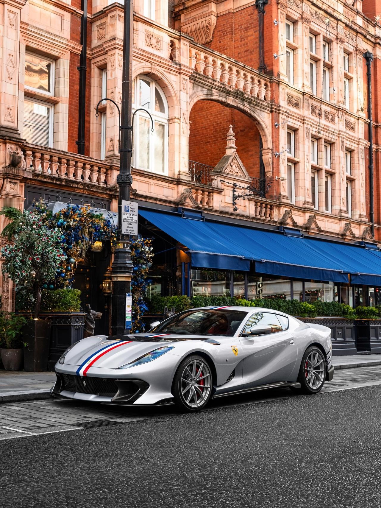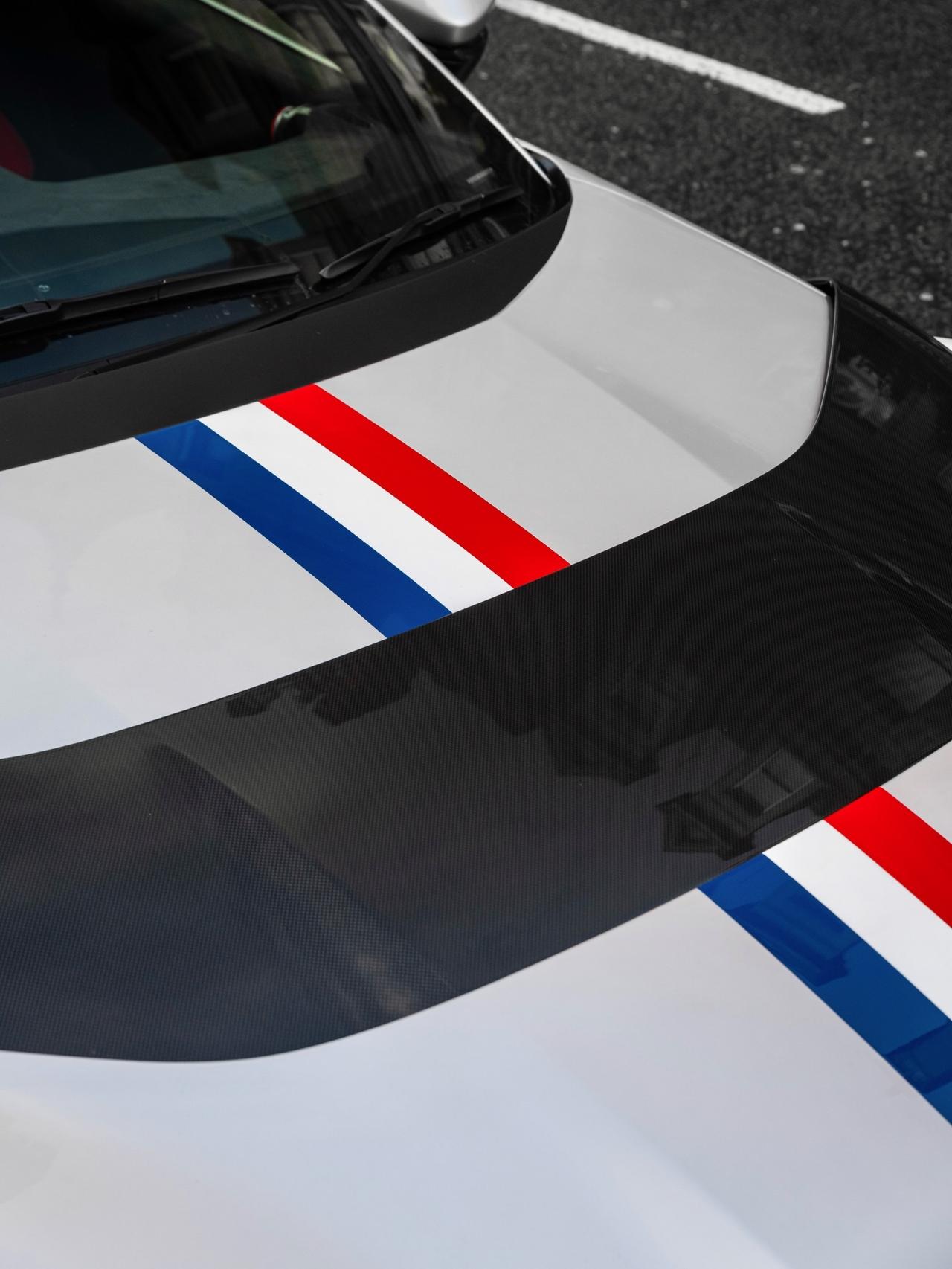 法拉利812 Competizione 图中红白蓝条纹+黄色徽标,复刻了经典车型250 GTO(底盘4153GT)的涂装;250 GTO是法拉利历史上最传奇的车型之一,收藏价值极高,此次812 Competizione的定制涂装属于向经典致敬的专属设计。