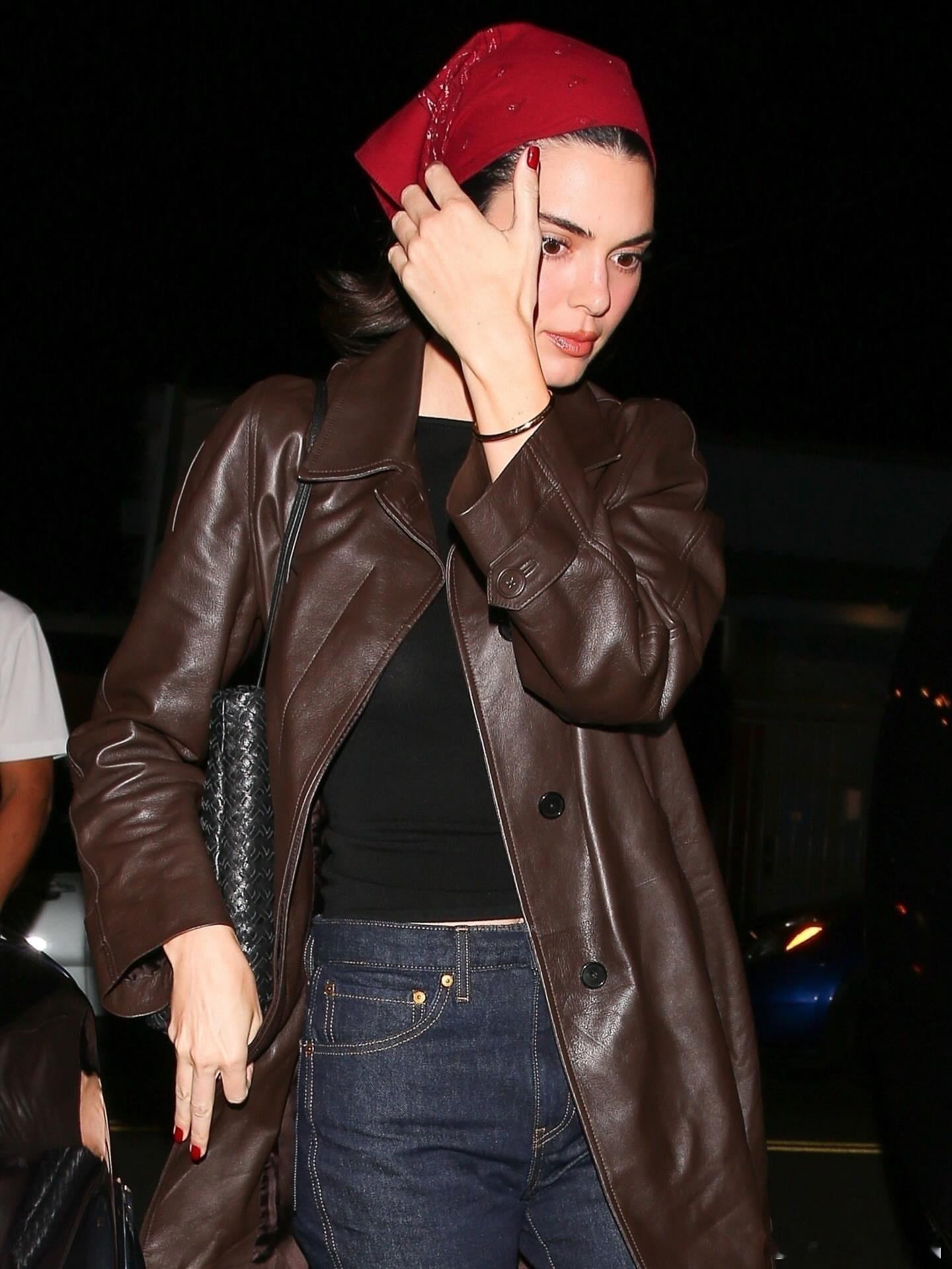 超模穿搭 肯豆 Kendall Jenner 在洛杉矶一家餐厅吃晚饭被拍到,穿了一件褐色皮风衣,搭配牛仔裤,头上还绑了红色头巾,背了黑色编织包。 时尚灵感解读