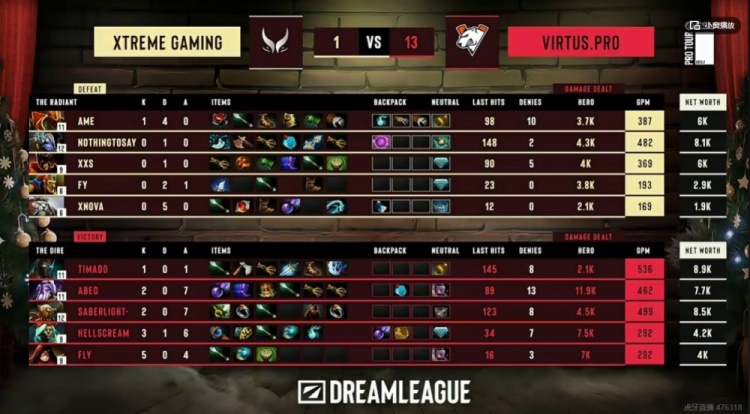 第三局开始Fy蝙蝠送出一血,XG的优势路也打不过,还让Hellscream奶绿支援中路强杀NTS的TK!Hellscream奶绿前期连续支援,10分钟VP拿下3K经济优势!13分钟Ame龙骑士在下路被强杀,VP一波1换4之后已经是7K经济差了!16分钟XG又被击杀三人,Ame直接敲出GG!这样XG战绩来到3-2,是否晋级将取决于明天的最后一轮瑞士轮了!