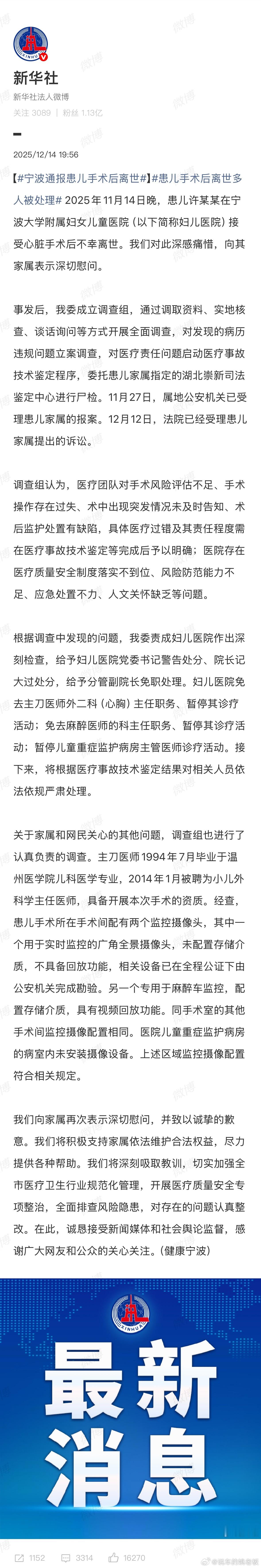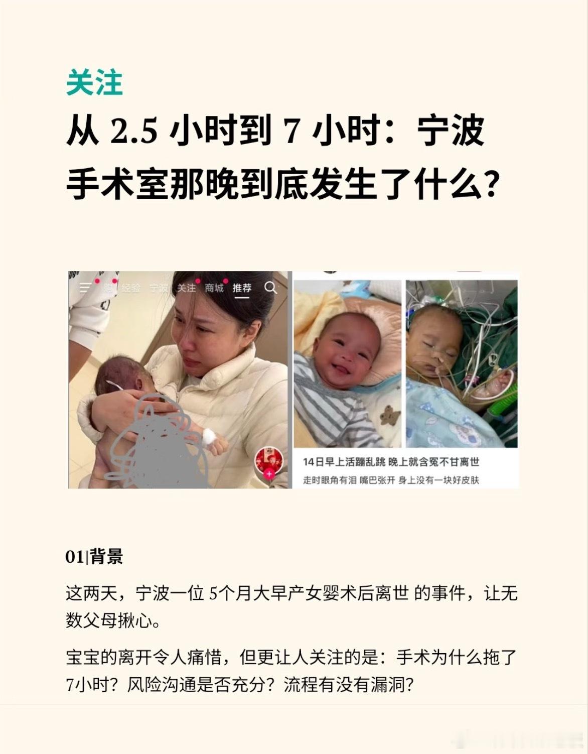 宁波通报患儿手术后离世一声啼哭,来到人间不过五月,一场手术,却成了与世界的永别。宁波这则沉甸甸的通报,是一个家庭的碎心之痛,也是无数人心中难以言说的沉重。我们无法想象,那七个小时的等待,是何等的煎熬与期盼,最终却等来天人永隔的结局。生命以如此脆弱的方式离去,任何“低风险”的预估都显得苍白。不仅需要对个体的问责,更是需要对生命的敬畏与制度的反思。愿小天使在天堂安息,愿调查能给悲伤的父母一个最公正的交代,也愿每一次生命的托付,都能被温柔以待!