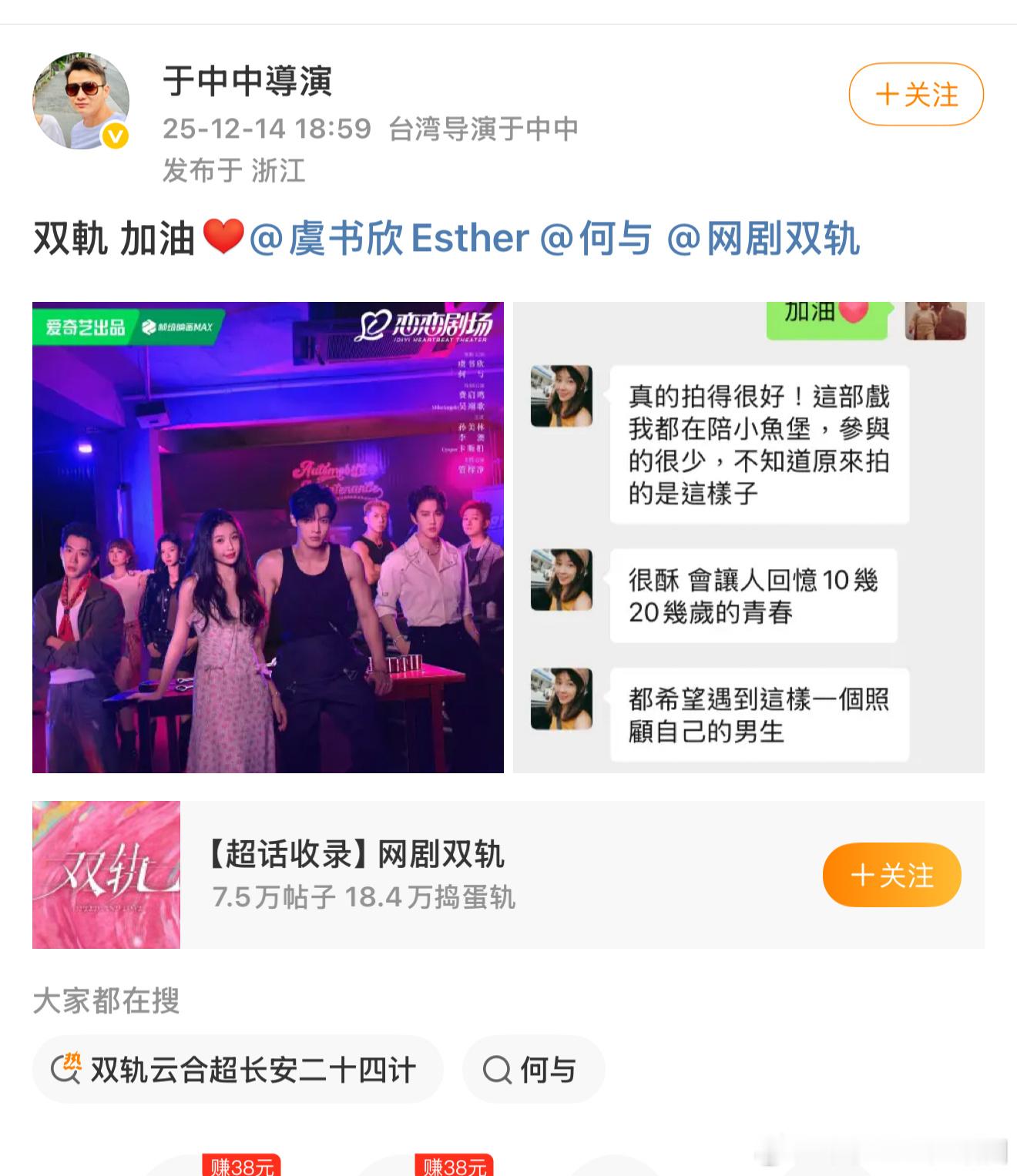 双轨的导演出来发文了,艾特了虞书欣和何与并配了聊天记录说“期待今天能冲一波”