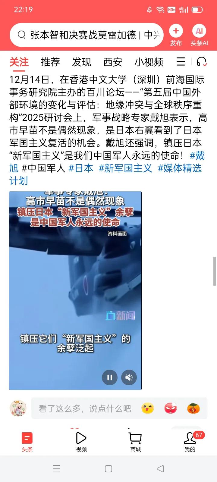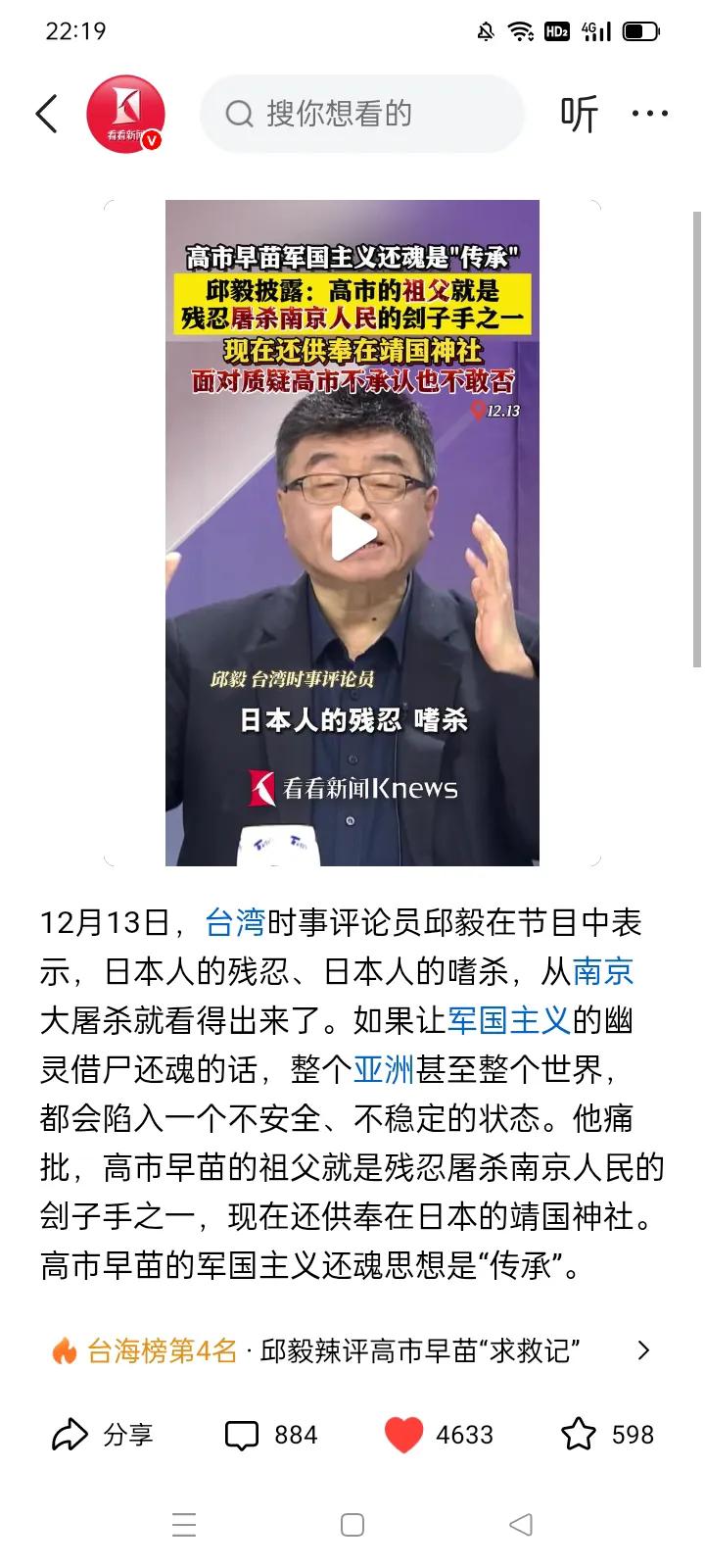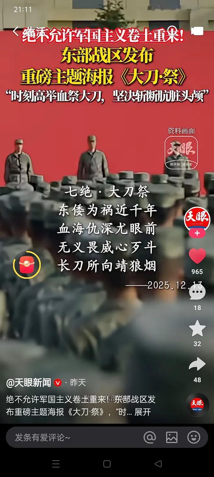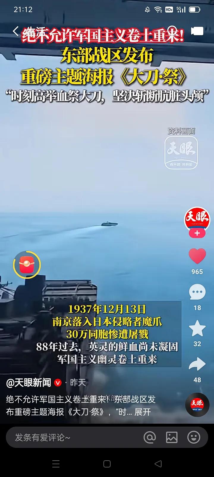 ‘大刀’向鬼子头上砍去! 军国主义日本是二战的罪魁祸首 现在鬼子的魔头又瞄准了中国 *联合国秘书长古特雷斯坦言:二战就是由日本侵略中国爆发的。 我说:日本就是二战的罪魁祸首! *昨天东部战区的《大刀祭》说得好: 东倭为祸近千年,血海仇深尤眼前。 无义畏威心歹斗,长刀所向靖狼烟。 1937年日本军国主义侵略军制造了南京大屠杀惨案,88年了,无辜遇难的30多万中国人民的鲜血尚未凝固,日本军国主义恶魔还要卷土重来! 中国人民解放军‘’时刻高举血祭大刀 坚决斩断肮脏头颅‘’! 这是讨伐倭寇的战斗檄文和冲锋号,既控诉了万恶的日本侵略者一千多年来屡屡侵略中国的滔天罪孽,更唤起中国人民同仇敌忾、振兴中华的昂扬斗志! *台湾的邱毅揭露说高市早苗的爷爷就是当年南京大屠杀的刽子手之一,后来一直被日本国人‘供奉’在烬倭鬼厕里! 难怪毒苗的车牌号是恶狠狠的37-77,毒苗急不可待地要发动侵略战争! 军事专家戴旭说‘日本右翼势力已经认准了现在就是全面复活军国主义(侵略)活动的大好时机’!而及时镇压日‘新’军国主义就是中国军人的天职使命! *一日纵敌数世之患! 当断不断反受其乱! 面对穷凶极恶的军国主义日本,中国必须掌握主动权,先发制敌。必须除恶务尽,以雷霆万钧之势、不遗余力地摧毁倭寇的有生力量,彻底清算消灭日本军国主义侵略势力,保家卫国,坚决保卫和平和正义!