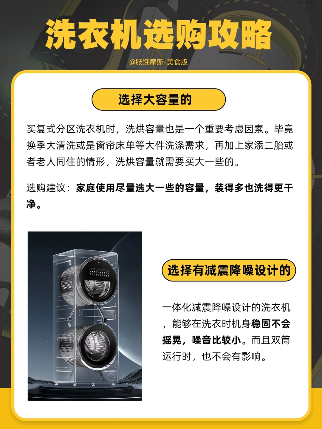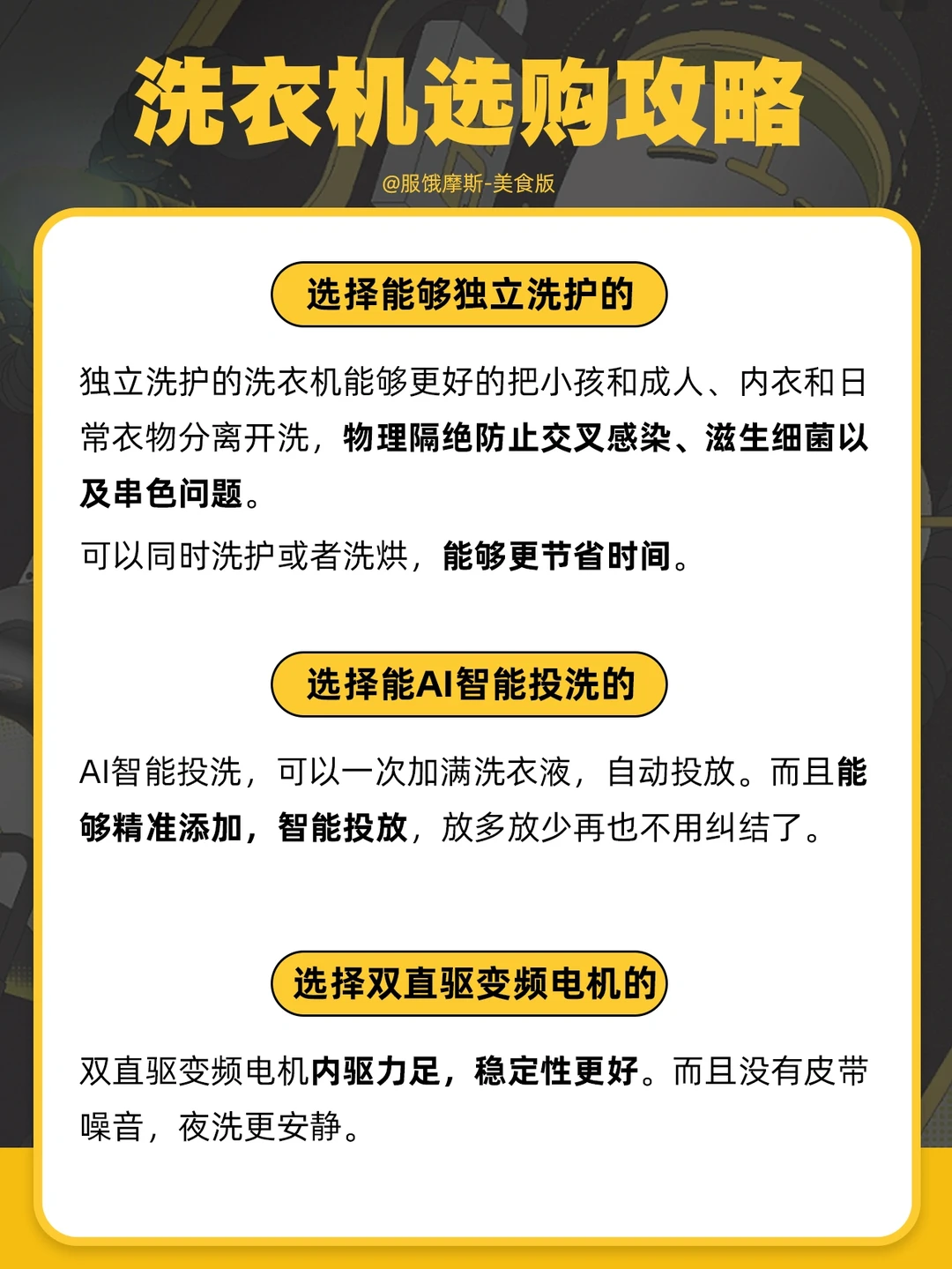 📍3. 选择双直驱变频电机的。双直驱变频电机内驱力足,稳定性更好,不会有皮带噪音,夜洗更安静。