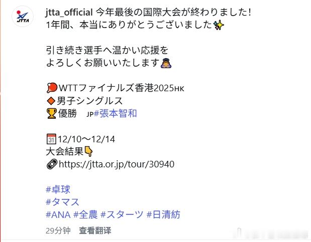 wtt年终总决赛25张本智和 JTTA发图祝贺“今年最后一场国际赛事圆满落幕!感谢大家一整年的支持与陪伴✨未来也请继续为选手们送上温暖的应援呀🙇♀️🏓2025WTT 香港总决赛🇭🇰🔸男子单打🏆冠军 🇯🇵张本智和”(机翻)