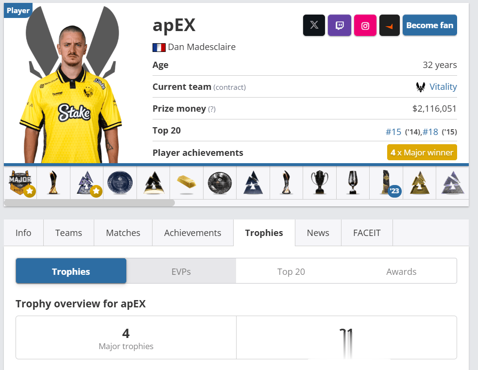 这位以激情指挥著称的“法国队长”,其职业生涯横跨CS:GO与CS2两个时代。从初出茅庐到成为历史第一,apEX用35座奖杯书写了一段关于坚持、领导力与胜利的传奇。他不仅是Vitality“九冠王朝”的缔造者之一,也以独一无二的冠军数量,在CS电竞史上刻下了自己的名字。