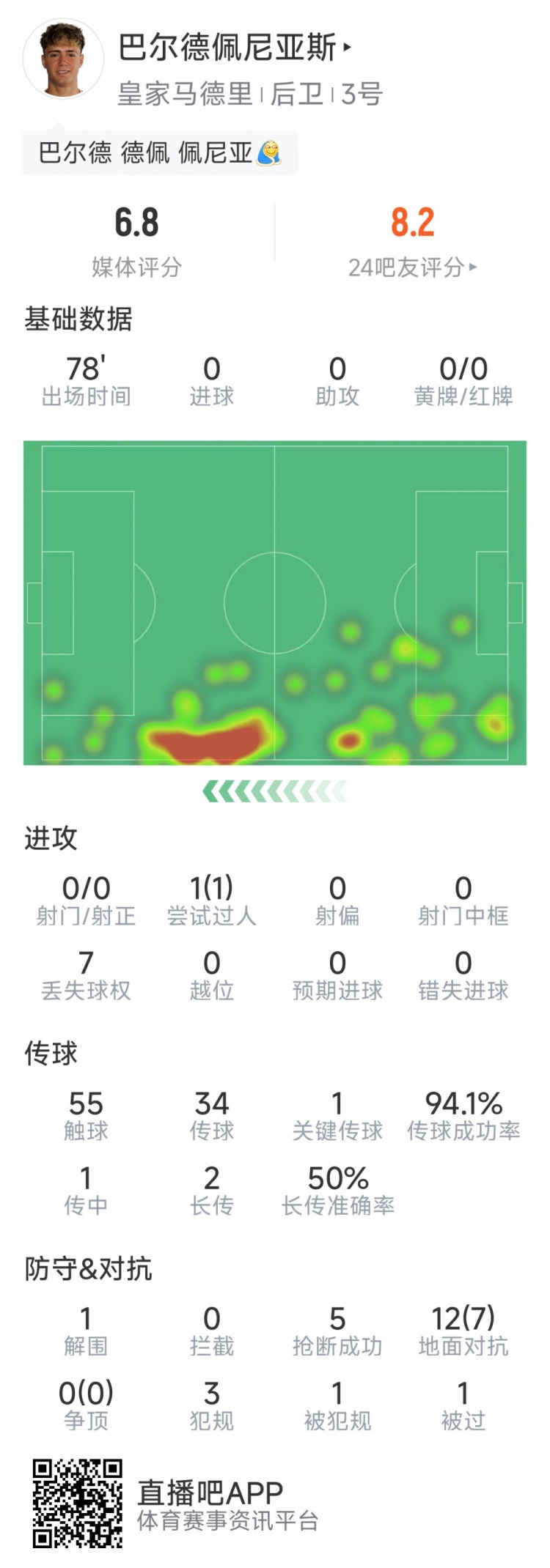 直播吧12月15日讯在本轮西甲皇马对阵阿拉维斯的比赛中,19岁小将巴尔德佩尼亚斯首发出场,以下为他在本场数据: