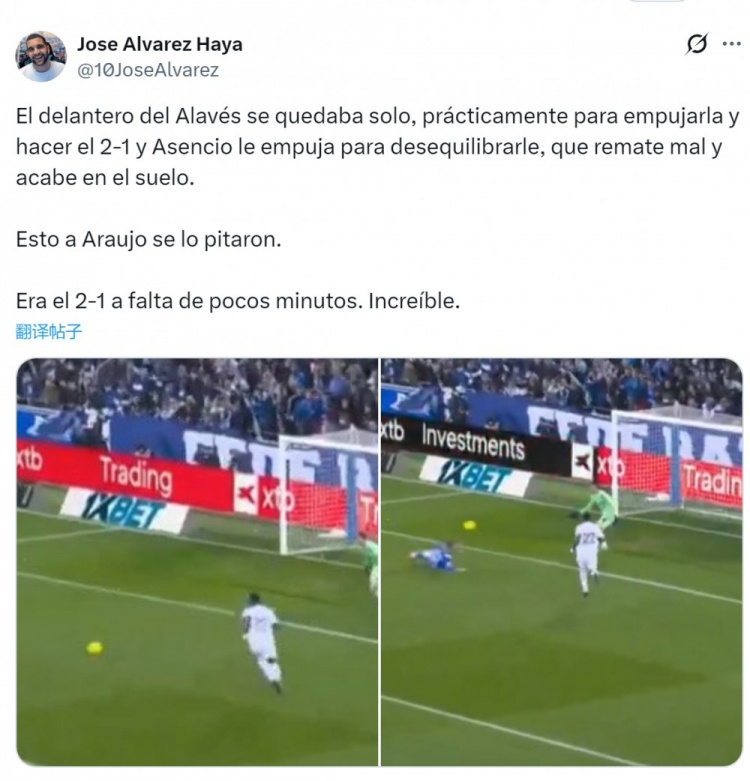 记者JoseAlvarezHaya社媒写道:“阿拉维斯前锋当时已形成单刀,几乎可以轻松将球推入球门,将比分改写为2-1。而阿森西奥从身后推搡,使他失去平衡,导致射门偏出并摔倒在地。阿劳霍此前(类似情况)就被判了点球。”