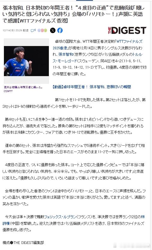 wtt年终总决赛25张本智和 【日媒】 《张本智和荣膺日本乒坛首位 WTT 总决赛年度冠军! 四度冲击终圆梦,坦言 “喜悦与难以置信交织” 用英语答谢全场 “哈利莫托” 应援【WTT 香港总决赛】》12 月 14 日(周日)23:29 发布评论 6 条2025 年 WTT 香港总决赛男子单打决赛于当地时间 12 月 14 日展开角逐。世界排名第五的张本智和以 4-2(11-8、5-11、11-9、10-12、14-12、11-2)的比分,击败巴黎奥运会银牌得主、世界排名第四的瑞典选手特鲁斯・莫雷高德,首次斩获该赛事冠军。历经四次挑战,他终于成为日本乒坛首位 WTT 总决赛年度冠军。张本智和在首局以 11-8 先声夺人。第二局虽告负,但第三局在 9-9 的胶着局面下连得分数,取得领先优势。第四局双方同样陷入一分必争的拉锯战。张本智和从一分落后的局面追至平分,却因连续丢分再失一局。决胜的第五局,对手曾两度手握赛点,张本智和沉着反击,凭借正手进攻追平比分,并以 14-12 逆转拿下该局,向着冠军宝座迈出关键一步。在决定命运的第六局,张本智和开局便以凌厉扣杀连得 5 分,大幅拉开分差压制对手。这位已然掌控比赛主动权的日本乒乓王牌,一鼓作气以 11-2 锁定胜局。四度冲击终圆冠军梦的张本智和,在赛场接受夺冠采访时坦言:“此刻的心情一半是由衷的喜悦,一半是难以置信。但说到底,喜悦还是占了上风。” 他难掩兴奋地表示:“已经很久没有尝到冠军的滋味了,百感交集,真的特别开心。”赛场内的香港球迷从比赛中段起,便不断以日语 “ハリモトー”(哈利莫托)为这位日本乒坛王牌呐喊助威。沐浴在球迷温暖的欢呼声中,张本智和用英语回应道:“真的非常感谢大家,我爱你们”,脸上洋溢着灿烂的笑容。本届赛事中,张本智和在四分之一决赛击败强敌法国选手费利克斯・勒布伦,半决赛又战胜世界排名第二的中国选手林诗栋,最终在决赛击退巴黎奥运会银牌得主,就此达成日本选手在 WTT 总决赛的历史首冠。Cr: THE DIGEST