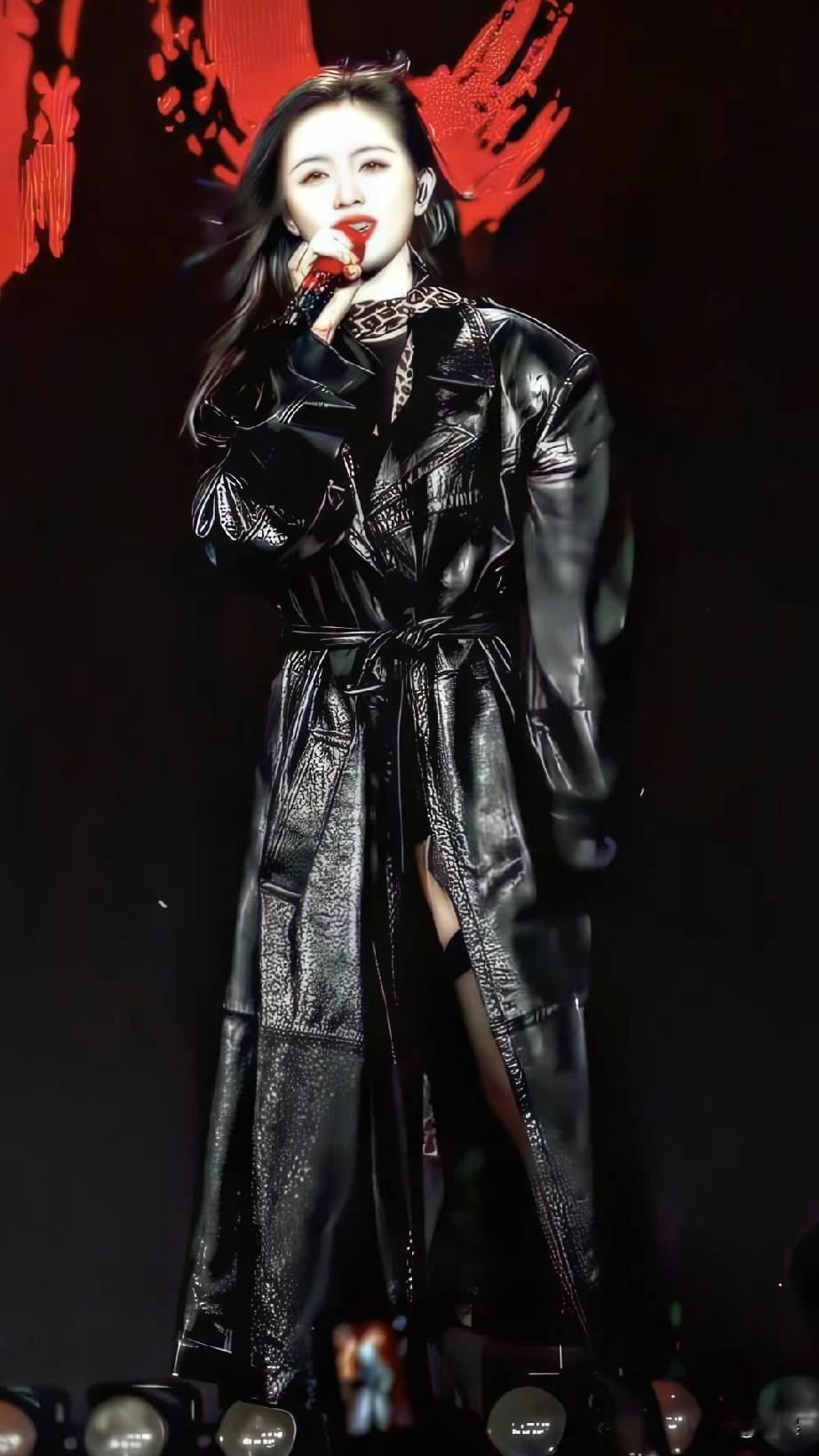舞台之上,吴宣仪如暗夜缪斯降临, 黑色皮革风衣裹挟着飒爽,开衩设计搭配黑丝