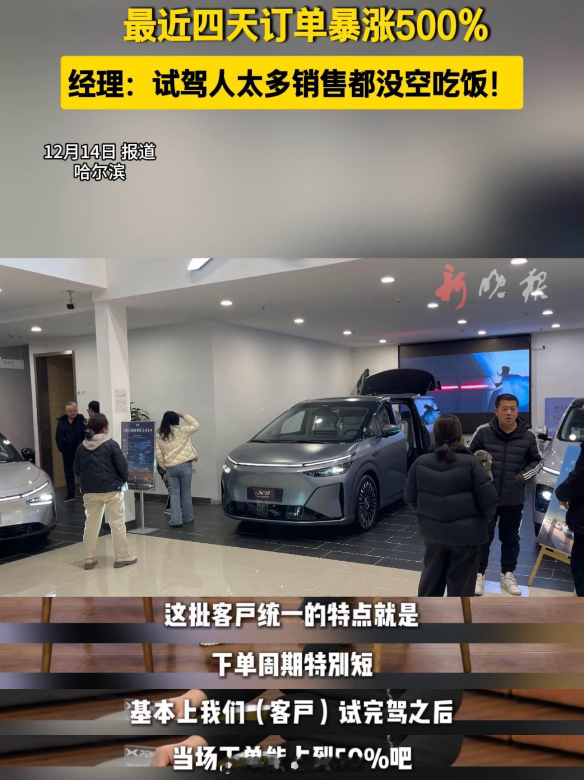 听说哈尔滨小鹏汽车门店订单量在4天内增长超500%,销售人员午饭都顾不上吃。而且用户购买决策非常果断,50%用户试驾完在现场即完成下定。小鹏X9超级增程试驾火爆销售没空吃饭50%用户试驾完小鹏X9超级增程当场下定看完之后有两个感悟1:X9增程太适合东北市场了。2.东北老爷们掏钱是真爽快。