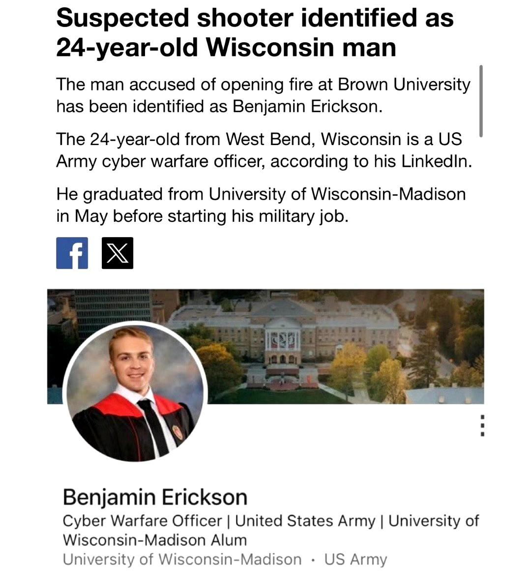 布朗大学校园枪击案在押嫌犯,是24岁白人男性,来自威斯康辛州,美国出生、长大,曾在陆军服役、去年底退役 动机依然不明