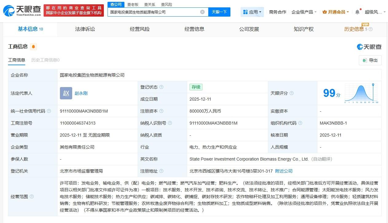 国家电投、国家电网成立生物质能源公司注册资本80亿 天眼查工商信息显示,近日,国家电投集团生物质能源有限公司成立,法定代表人为赵永刚,注册资本80亿人民币,经营范围包括太阳能发电技术服务、风力发电技术服务、储能技术服务、生物质燃料加工、生物质成型燃料销售等。股东信息显示,该公司由国家电力投资集团有限公司、国家电网旗下国网综合能源服务集团有限公司共同持股。 天眼查信息: