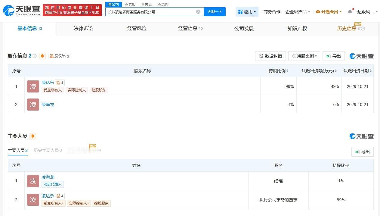 鹿哈卸任商务公司法定代表人 鹿哈卸任名下公司法定代表人 天眼查App显示,近日,长沙凌达乐商务服务有限公司发生工商变更,凌达乐(网红鹿哈)卸任法定代表人、经理,由凌海龙接任。 该公司成立于2024年10月,注册资本50万人民币,经营范围包括互联网直播技术服务、食品销售、互联网销售、个人互联网直播服务等。股东信息显示,该公司由凌达乐、凌海龙共同持股。 天眼查信息: