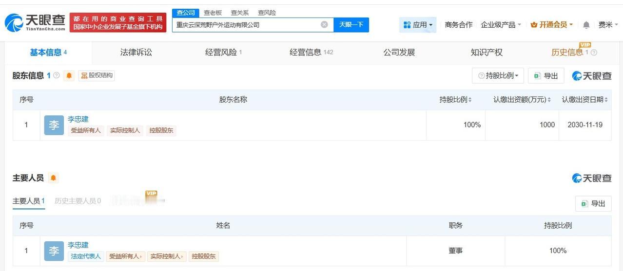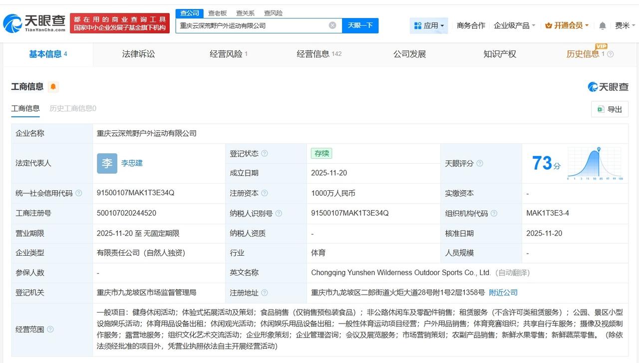 榕江荒野求生活动主办方经营异常 天眼查经营风险信息显示,近日,重庆云深荒野户外运动有限公司因通过登记的住所或者经营场所无法联系,被重庆市九龙坡区市场监督管理局列入经营异常名录。 该公司成立于今年11月,法定代表人为李忠建,注册资本1000万人民币,经营范围包括健身休闲活动、体验式拓展活动及策划、食品销售等,由李忠建全资持股。 据媒体报道,此前,贵州榕江县通报两汪乡荒野求生赛事相关情况,该公司因涉嫌存在违法犯罪行为,相关责任人已被依法立案侦查。 天眼查信息: