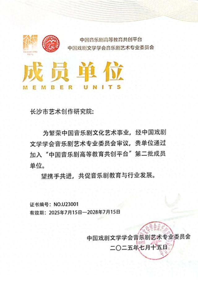 长沙市艺术创作研究院作为长沙市唯一的舞台剧本创作单位,建院七十多年来,长期深耕戏曲创作,与院团联合创排的剧目屡获全国全省大奖。“以歌舞讲故事”的戏曲与音乐剧之间有许多共通之处。此次入选成员单位,标志着该院正式融入这一国家级专业协作平台,这一重要进展,将开启该院在音乐剧创作领域的新征程,为长沙艺术事业注入新的发展动能。