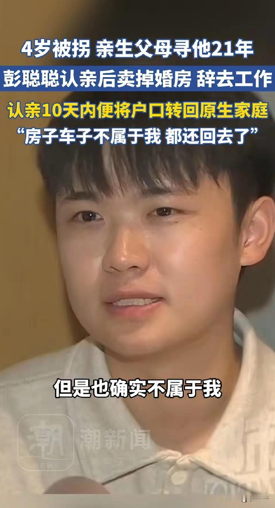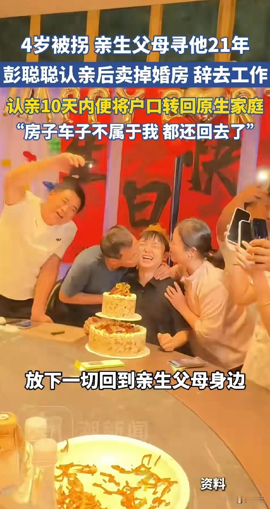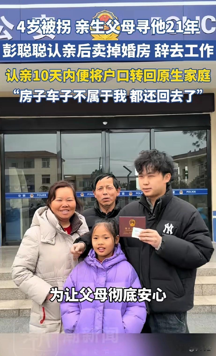 这是不是所有寻亲父母最希望看到的!被拐21年的彭聪聪得知自己的身世,果断注销了原户口,回归亲生父母户口本,辞掉了工作,卖掉了养父母给他准备的婚房,将车和房全都还回去,婚房还是他自己亲自装修的! 彭聪聪说虽然婚房和车都是为他准备的,但是那已经不属于他,所以也必须还回去。如果是人家孩子,可以接受父母给的车房,但是他们不是亲生父母,自然也不能要别人的东西。 用实际行动弥补亲生父母心底的伤痛,血缘亲人才是真正的家人,毅然选择回到亲生父母身边。 不得不说彭聪聪真的很清醒,不论养父母条件多么好,但是或许是因为性别和封建思想养育了他。 而亲生父母却为找他了漂泊21年,亲父母对他的爱是最无私的,他深刻明白这一点,所以果断回了自己真正的家。 很多寻亲父母即便找到了孩子,也难以和孩子亲近,甚至有的人已经习惯了养家的生活,知道真相也不愿意回归。有的甚至还对父母充满了埋怨,责怪父母弄丢了孩子,到最后徒留父母白白伤心。 有人说彭聪聪无情,毕竟人家养了那么久,还买车买房,结果他一走了之。但是谁又能体会亲父母的心酸,支离破碎的21年?他不是无情,而是心疼!