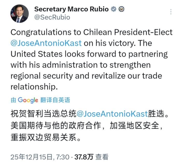 智利变天,美国国务卿祝贺智利新当选总统。美国国务卿鲁比奥今天(北京时间12月15日)发文写道:“祝贺智利当选总统何塞·安东尼奥·卡斯特胜选。美国期待与他的政府合作,加强地区安全,重振双边贸易关系。” 美国国务卿嘴上说着“加强地区安全”“重振双边贸易”,明眼人一看就知道,这是冲着智利的资源和拉美“后院”的控制权来的。 这次当选的卡斯特可不是一般人,59岁的他从政近30年,第三次竞选总统才成功,背后是极右翼的智利共和党撑腰。他的竞选口号是“变革的力量”,核心主张就是减少国家干预、削减税负,还把公共安全和移民问题绑在一起,要建高安全级别的监狱、大规模驱逐非法移民,这路子跟美国现在的政策简直不谋而合。 美国现在正推行“新门罗主义”,对拉美又打又拉,看到卡斯特这样的右翼领导人上台,自然要第一时间递上橄榄枝,毕竟之前拉美左翼执政时,美国的影响力可是被削弱了不少。 说穿了,美国对智利的“热情”,从来都不是免费的午餐。智利手里的宝贝太多了,作为全球最大的铜供应国,铜出口占总出口额的一半以上,而锂储量更是全球第一,占了全球探明储量的41%还多,这些都是现在新能源时代的硬通货,不管是电动汽车还是储能设备,都离不开锂资源。 美国早就跟智利签了自贸协定,2015年就实现了贸易零关税,现在喊着“重振双边贸易”,说白了就是想稳住这些关键资源的供应,毕竟美国的科技和新能源产业,可离不开智利的矿产。 更关键的是,鲁比奥这个人本身就对拉美没安好心。他之前出访拉美时,就到处施压,一会儿威胁要夺巴拿马运河,一会儿逼迫各国接收遣返移民,还总抹黑中国在拉美“搞剥削”。这次卡斯特当选,美国急于合作,还有个小心思就是想拉拢智利,遏制中国在拉美的影响力。 要知道,中国才是智利真正的第一大贸易伙伴,连续十几年都是,2021年双边贸易额就达到610亿美元,智利的樱桃、牛油果80%以上都出口到中国,锂产品也有一半多销往中国,中智自贸协定升级版早就生效了,合作一直是互利共赢。 美国所谓的“加强地区安全”,也根本不是为了智利好。最近美国在加勒比海域集结了大量军力,航母、战机都派过去了,名义上是打击贩毒,实际上是想威慑拉美国家,维护自己的霸权。 卡斯特在竞选时重点提公共安全,美国正好借机绑定,想让智利配合自己的地区战略,打压左翼势力,防止拉美国家跟其他大国走近。这种“胡萝卜加大棒”的套路,美国在拉美用了几十年,之前入侵巴拿马、干涉委内瑞拉,都是这套逻辑,本质就是把拉美当成自己的“后花园”,不允许别人染指。 不过智利也不是那么好拿捏的,作为拉美第一个跟中国建交的国家,智利一直奉行开放的贸易政策,跟64个经济体签了28个自贸协定,早就不是只能依附美国的国家了。 中智合作一直是平等互利,中国投资智利的能源、基础设施,还帮智利开拓市场,而美国的合作从来都是附带条件的,之前就有国家因为不配合美国的立场,被暂停援助还遭关税威胁。卡斯特上台后要发展经济,肯定不会只押注美国,毕竟中国这个第一大贸易伙伴的分量,可比美国的“口头支持”实在多了。 鲁比奥的祝贺看似客气,实则充满了霸权思维。美国现在在全球到处搞对抗,拉美这个“后院”自然不能放松,抓住卡斯特当选的机会拉拢智利,既想稳住资源供应,又想遏制其他大国的影响力,算盘打得噼啪响。 但时代早就变了,拉美国家追求战略自主的意识越来越强,厄瓜多尔公投拒绝美国军事基地,巴西、墨西哥也在推动区域一体化,美国想再像以前那样随意操控拉美,已经越来越难了。 智利未来的发展,终究还是要靠自己选对路,而不是被美国牵着鼻子走。中智之间的合作是基于相互尊重和共同利益,这种合作才能长久,而美国那种带着地缘政治算计的“合作”,迟早会暴露真面目。 鲁比奥现在喊得欢,能不能真正达成自己的目的,还得看智利是不是愿意当美国的“棋子”,毕竟没有哪个国家愿意放弃自主,去依附别人的霸权。