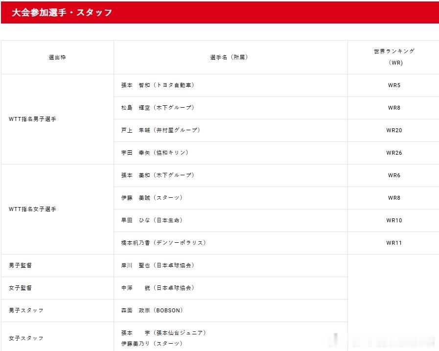 WTT多哈冠军赛2026张本智和 日本队球员和随行人员名单。cr:Jtta