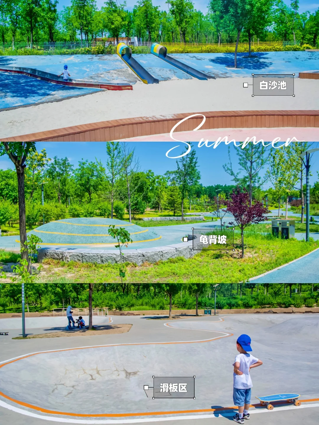 前者有三个大滑梯,一整个白沙池,沙子很细腻。后者是儿童设施,滑梯攀爬。建议早晚玩儿,白天会有点热