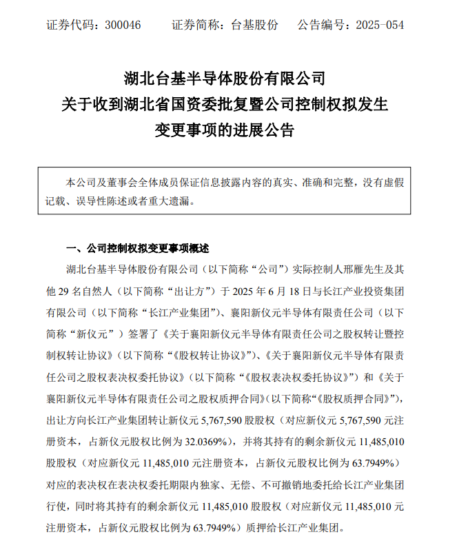 12月15日,台基股份(300046.SZ)公告称,公司收到湖北省国资委批复,原则同意长江产业集团通过间接受让方式取得公司实际控股权。本次交易的《股权转让协议》、《股权表决权委托协议》、《股权质押合同》已正式生效。出让方已按照《股权质押合同》将约定的新仪元11,485,010股股权质押给长江产业集团。长江产业集团将会同出让方、新仪元办理股权过户登记相关手续。本次权益变动完成后,公司实际控制人由邢雁变更为湖北省国资委。
