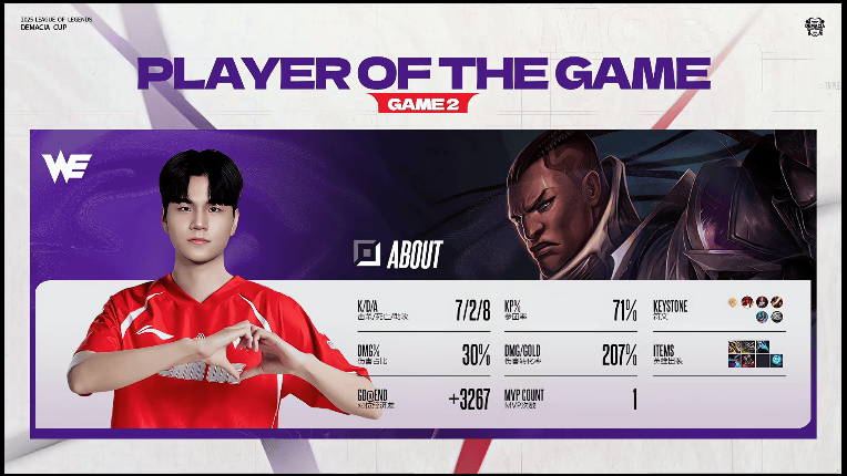 About使用卢锡安打出7/2/8战绩,斩获WE对阵FRK第二局MVP