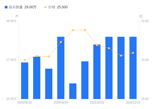 日期A股户数(户)流通A股户均持股数(股)户均持股市值(万元)2025-12-102900009862.3425.152025-11-282900009862.3424.582025-11-102900009862.3426.092025-10-3128500010035.3727.182025-09-3027417410431.6231.482025-09-1926000011000.3133.172025-08-202900009862.3427.332025-07-3126950010612.5426.242025-07-1827720010317.7525.642025-06-3027348610457.8725.09