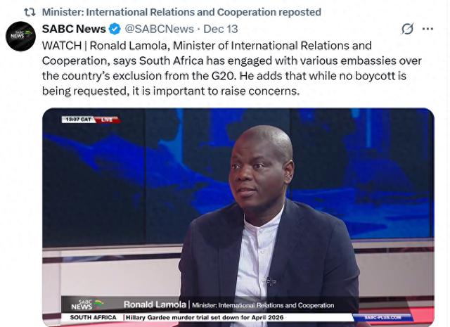 拉莫拉在接受南非广播公司采访时表示,若未收到美国方面正式邀请,南非不会出席明年在美国迈阿密举行的G20峰会。他同时强调,即便被排除出G20相关活动,南非也不会对明年的峰会进行抵制。“如果我们选择抵制,只会进一步给美国单独行事的空间,因此必须与其保持接触。”