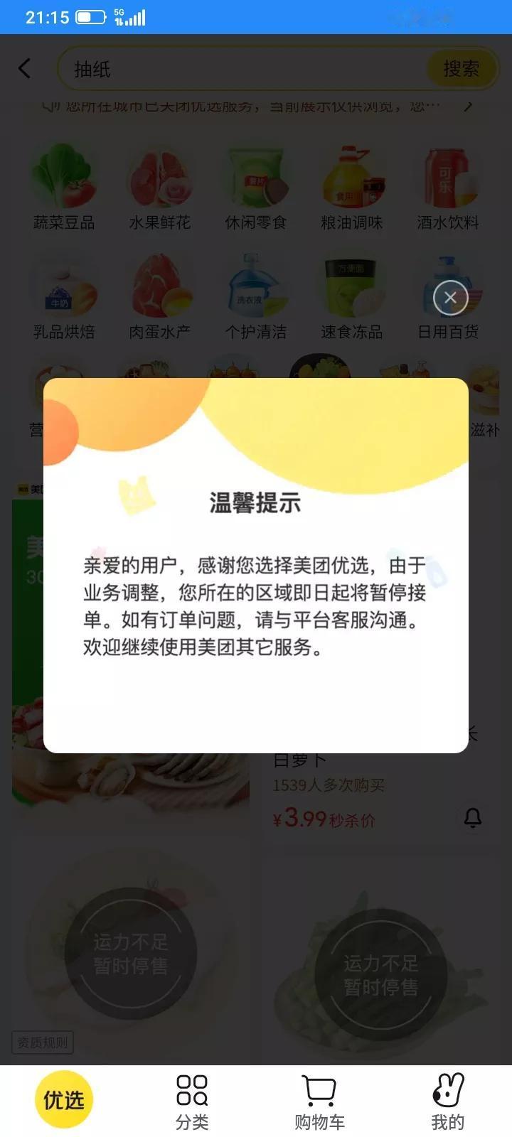 美团怎么了,我在广东中山黄圃,今天打开我的美团首页,已经找不到美团优选了,后来在消息里面,找到一条消息,点击出来了美团优选,提示暂停了,蔬菜生意不做了吗?提示什么运力不足,现在是货运市场的春天来了吗?我以前开货车,到处都找不到货拉,现在他们怎么运力不足了呀。