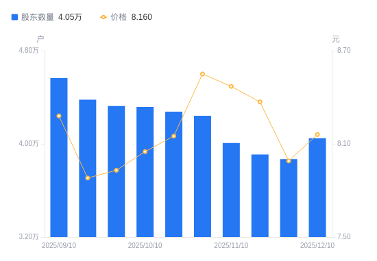 日期A股户数(户)流通A股户均持股数(股)户均持股市值(万元)2025-12-104048714869.5512.132025-11-283868615561.7912.432025-11-203909215400.1712.892025-11-104008015020.5412.722025-10-314240614196.6612.142025-10-204276014079.1311.472025-10-104317513943.8011.222025-09-304325613917.6911.042025-09-194379613746.0810.832025-09-104564113190.4110.92