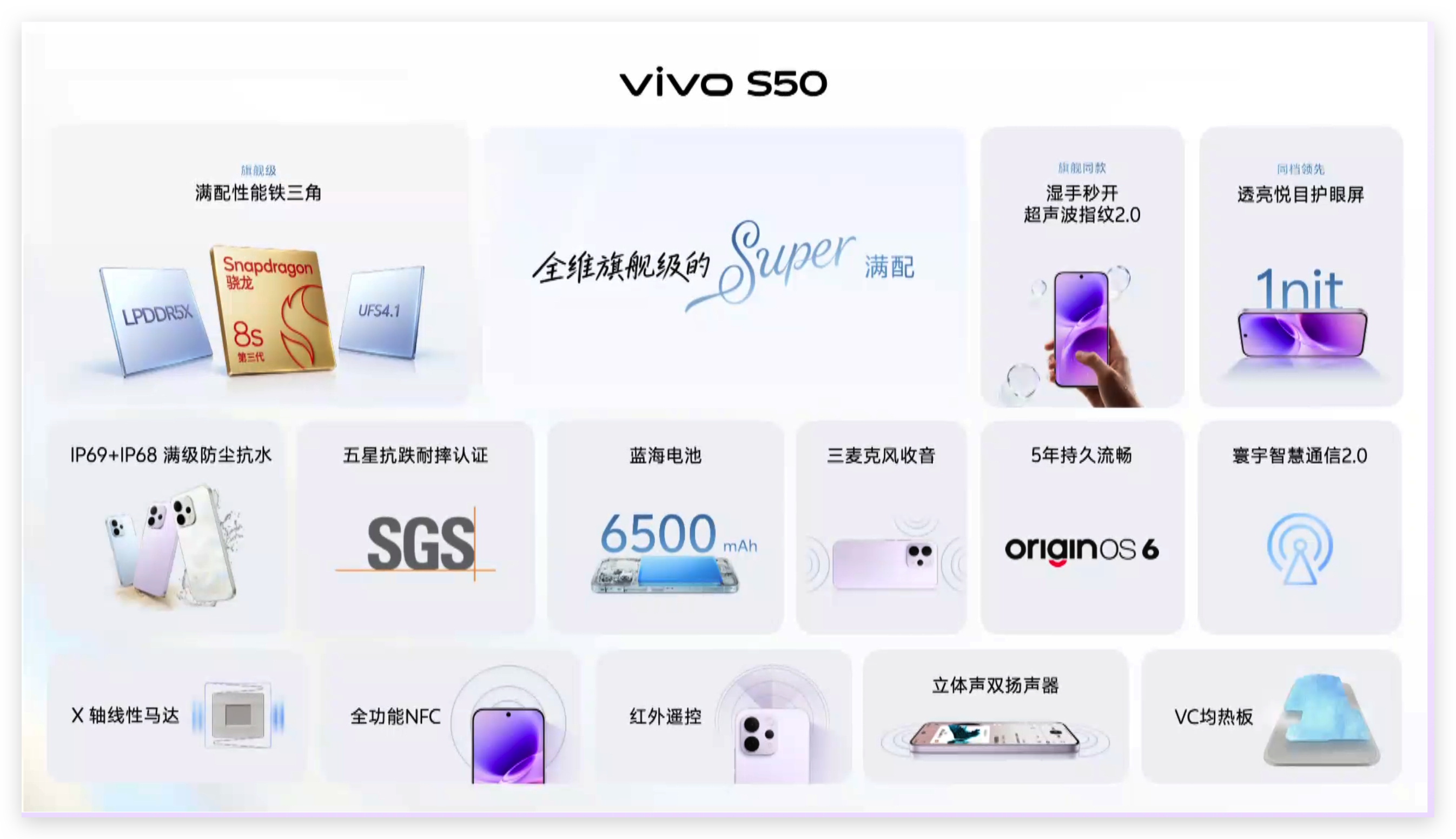 vivo S50采用了第三代骁龙8s + LPDDR5X + UFS4.1 的组合,安兔兔跑分200W+,支持内存融合技术,屏幕部分支持最低1nit亮度,局部峰值亮度5000nit,6500mAh大电池,支持最高90W闪充,支持IP69+IP68 满级防尘防水。