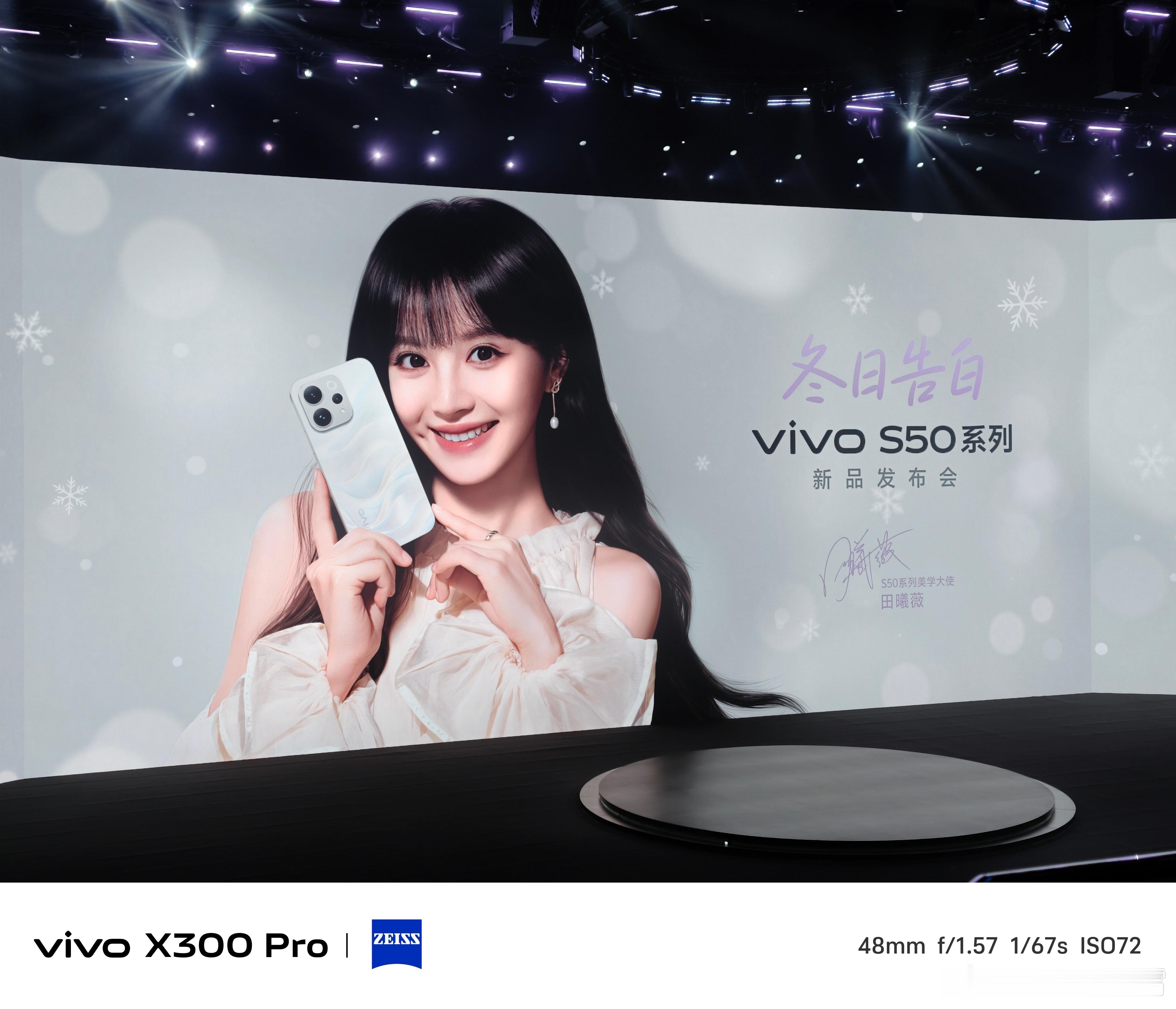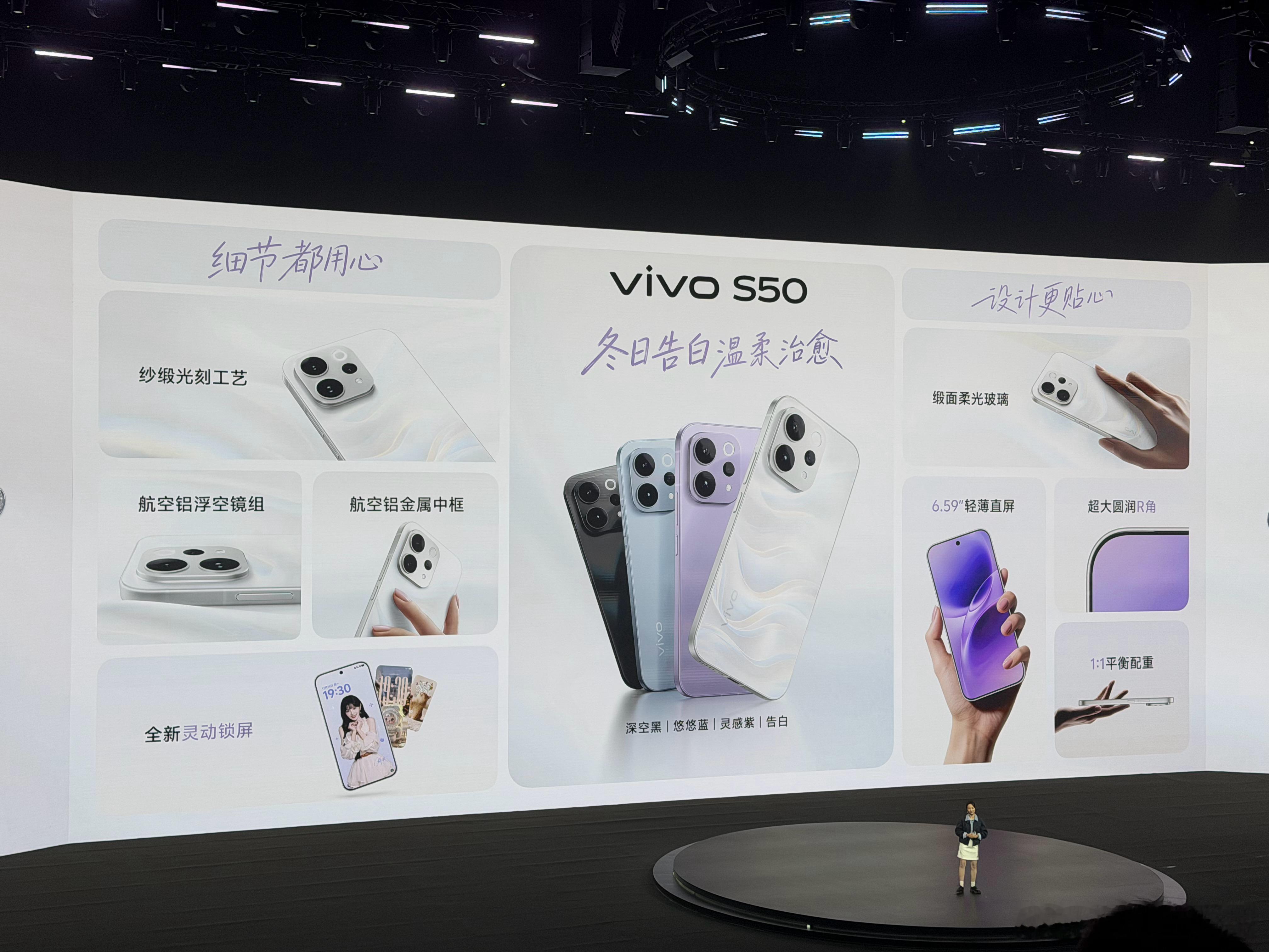 vivo S50这次提供告白、悠悠蓝、灵感紫、深空黑4个色,6.59英寸直屏,支持120Hz高刷、4320Hz高频PWM调光,5000万主摄 + 5000万索尼IMX882潜望长焦 + 800万超广角三摄,Live方面玩法整了挺多,例如高光慢动作Live运镜、变焦Live运镜、希区柯克Live运镜等等。搭载骁龙8s Gen3处理器,LPDDR5X + UFS 4.1,内置6500mAh电池 + 90W有线闪充,支持IP68 & 69防尘防水、超声波指纹、立体双扬,没想到田曦薇也来到了现场,你们喜欢小田吗