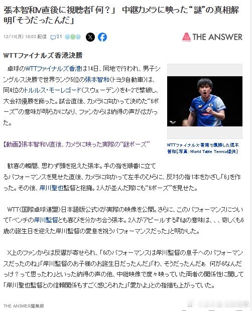 wtt年终总决赛25张本智和 夺冠后和教练一起比6,是在庆祝岸川教练的爱子迎来 6 岁生日【日媒】《张本智和夺冠后引观众疑惑 镜头捕捉 “神秘手势” 真相揭晓 网友恍然大悟》12 月 15 日(周一)18:03 发布 21 条评论在 WTT 香港乒乓球总决赛男单决赛中,世界排名第五的张本智和(丰田汽车队)以 4-2 击败世界排名第四的瑞典选手特鲁斯・莫雷加德,斩获个人职业生涯首个该赛事冠军。比赛刚结束时,他对着镜头比出的 “6” 字手势引发热议,谜底揭开后,粉丝们纷纷表示恍然大悟。夺冠喜悦的瞬间,张本智和激动地抱头,随后依次竖起手指,紧接着对着镜头用左手手掌配合另一只手的一根手指比出了数字 “6”。之后他与教练岸川圣也相拥庆祝,两人并肩时,他又一次比出了这个 “6” 字手势。国际乒联(WTT)日语版官方 X 账号发布了现场视频,并揭晓了这个手势的含义:“夺冠后,张本智和与场边的岸川教练一同分享喜悦。两人比出的‘6’,其实是为了庆祝岸川教练的爱子迎来 6 岁生日。”这条内容在 X 平台引发粉丝热议,除了 “原来比 6 是为了祝贺岸川教练的儿子呀”“原来是岸川教练孩子的生日”“哇,难怪呢,刚才还在好奇这个 6 是什么意思” 这类恍然大悟的留言外,还有不少网友留意到转播镜头里二人的互动,感慨 “能感受到张本智和与岸川圣也教练之间深厚的信任”“这也太有爱了”。(机翻)Cr:THE ANSWER