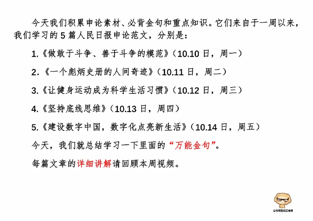 今天我们积累申论素材、必背金句和重点知识。它们来自于一周以来,我们学习的5篇人民日报申论范文,分别是: