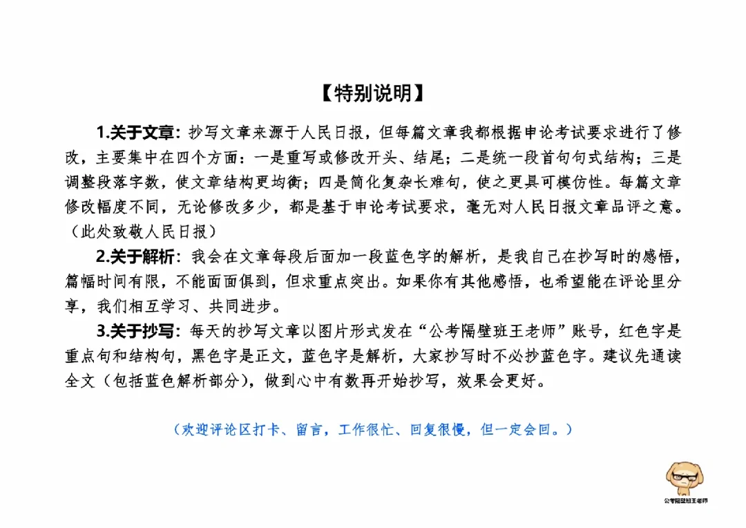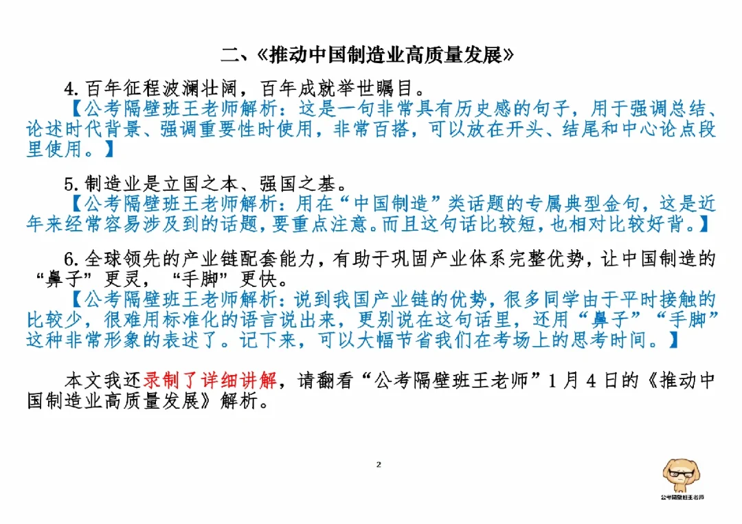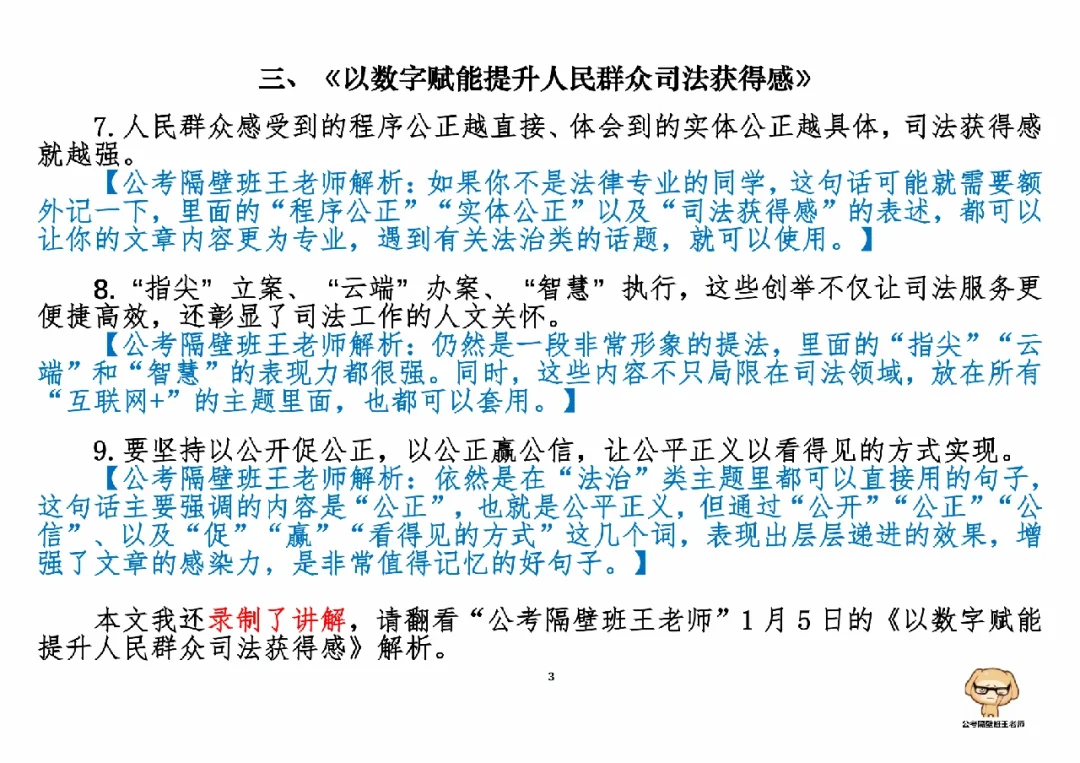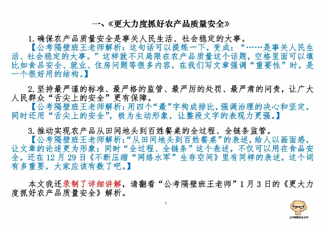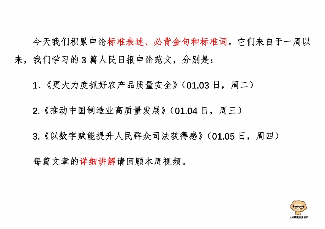 今天我们积累申论素材、必背金句和重点知识。它们来自于一周以来,我们学习的3篇人民日报申论范文,分别是: 1.《更大力度抓好农产品质量安全》(01.03日,周二) 2.《推动中国制造业高质量发展》(01.04日,周三) 3.《以数字赋能提升人民群众司法获得感》(01.05日,周四) 今天,我们就总结学习一下里面的“万能金句”。 每篇文章的详细讲解请回顾本周视频。 ⭐⭐⭐⭐⭐⭐ 这里是公考隔壁班王老师独创的“每天半小时・申论80分”抄写团,欢迎加入我们!