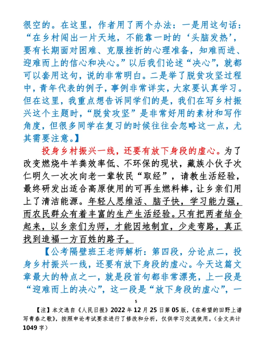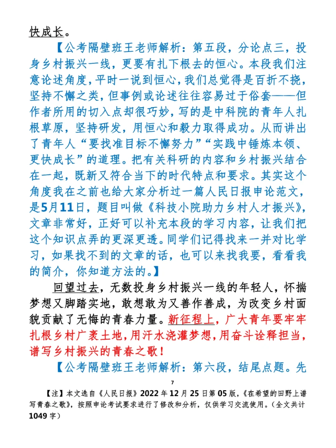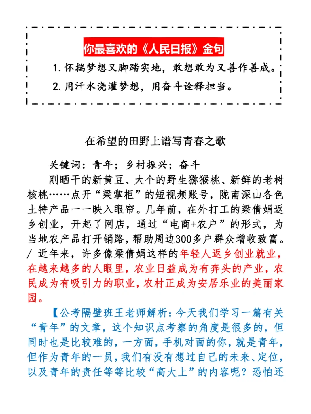 今日打卡作业: 1. 选一句你最喜欢的金句 2. 抄写全文红字+划线部分内容 3. 写完后在留言区打卡 ⭐️ ⭐️ ⭐️ ⭐️ ⭐️ ⭐️ 如何抄写:每天的抄写文章以图片形式发在“公考隔壁班王老师”账号,红色字是重点句和结构句,黑色字是正文,蓝色字是解析,大家抄写时不必抄蓝色字。建议先通读全文(包括蓝色解析部分),做到心中有数再开始抄写,效果会更好。 关于文章:抄写文章来源于人民日报,但每篇文章我都根据申论考试要求进行了修改,主要集中在四个方面:一是重写或修改开头、结尾;二是统一段首句句式结构;三是调整段落字数,使文章结构更均衡;四是简化复杂长难句,使之更具可模仿性。每篇文章修改幅度不同,无论修改多少,都是基于申论考试要求,毫无对人民日报文章品评之意。(此处致敬人民日报) 关于解析:我会在文章每段后面加一段蓝色字的解析,是我自己在抄写时的感悟,篇幅时间有限,不能面面俱到,但求重点突出。如果你有其他感悟,也希望能在评论里分享,我们相互学习、共同进步。 ⭐️ ⭐️ ⭐️ ⭐️ ⭐️ ⭐️ 这里是公考隔壁班王老师独创的“每天半小时・申论80分”抄写团,欢迎加入我们!