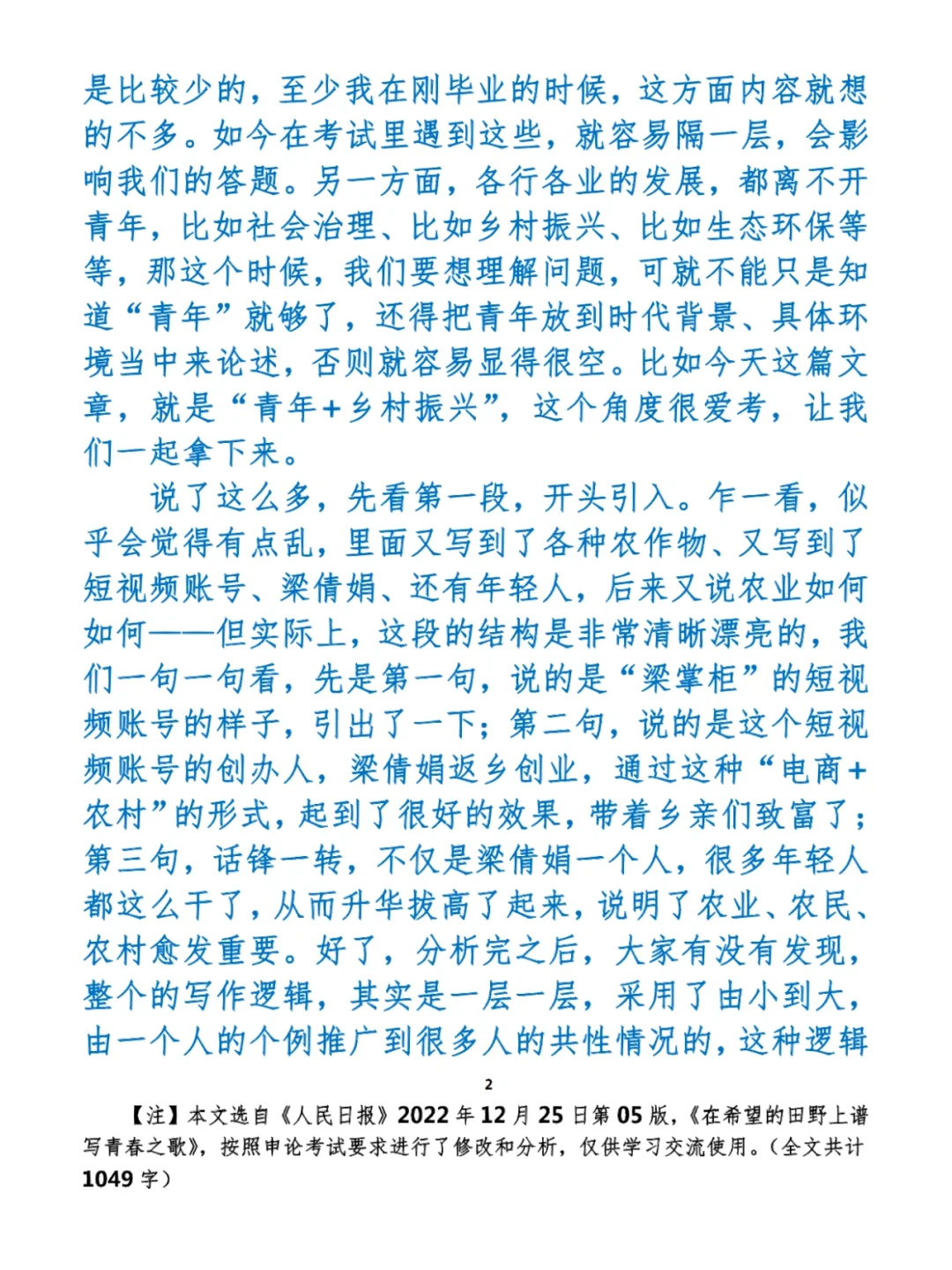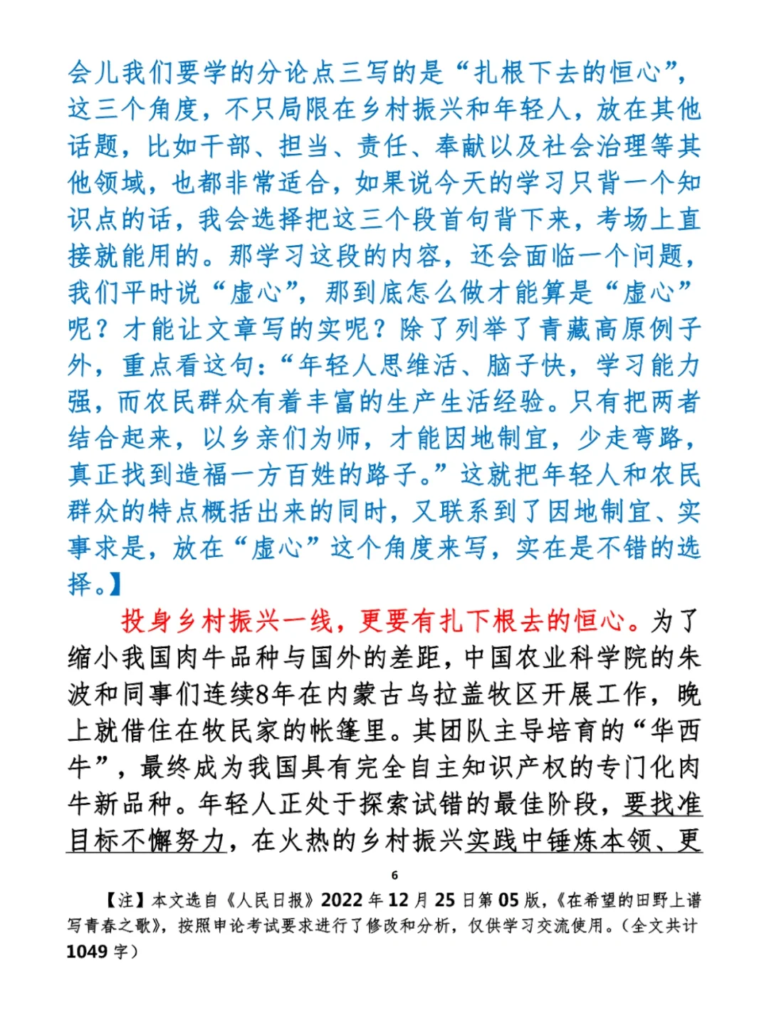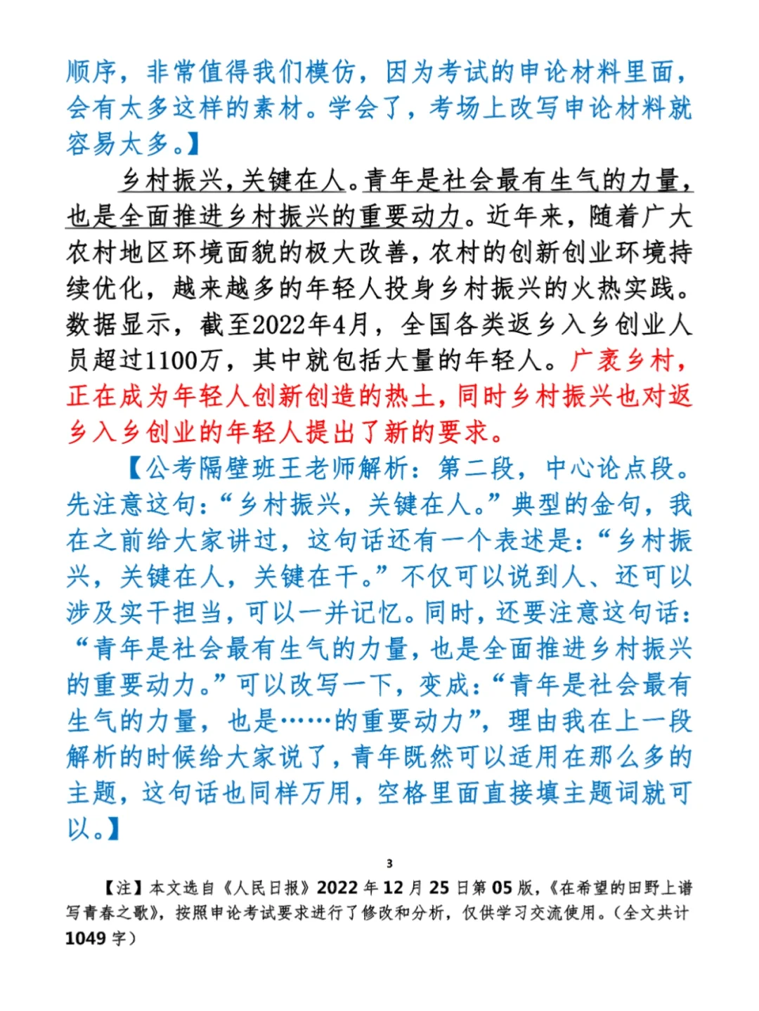 今日打卡作业: 1. 选一句你最喜欢的金句 2. 抄写全文红字+划线部分内容 3. 写完后在留言区打卡 ⭐️ ⭐️ ⭐️ ⭐️ ⭐️ ⭐️ 如何抄写:每天的抄写文章以图片形式发在“公考隔壁班王老师”账号,红色字是重点句和结构句,黑色字是正文,蓝色字是解析,大家抄写时不必抄蓝色字。建议先通读全文(包括蓝色解析部分),做到心中有数再开始抄写,效果会更好。 关于文章:抄写文章来源于人民日报,但每篇文章我都根据申论考试要求进行了修改,主要集中在四个方面:一是重写或修改开头、结尾;二是统一段首句句式结构;三是调整段落字数,使文章结构更均衡;四是简化复杂长难句,使之更具可模仿性。每篇文章修改幅度不同,无论修改多少,都是基于申论考试要求,毫无对人民日报文章品评之意。(此处致敬人民日报) 关于解析:我会在文章每段后面加一段蓝色字的解析,是我自己在抄写时的感悟,篇幅时间有限,不能面面俱到,但求重点突出。如果你有其他感悟,也希望能在评论里分享,我们相互学习、共同进步。 ⭐️ ⭐️ ⭐️ ⭐️ ⭐️ ⭐️ 这里是公考隔壁班王老师独创的“每天半小时・申论80分”抄写团,欢迎加入我们!