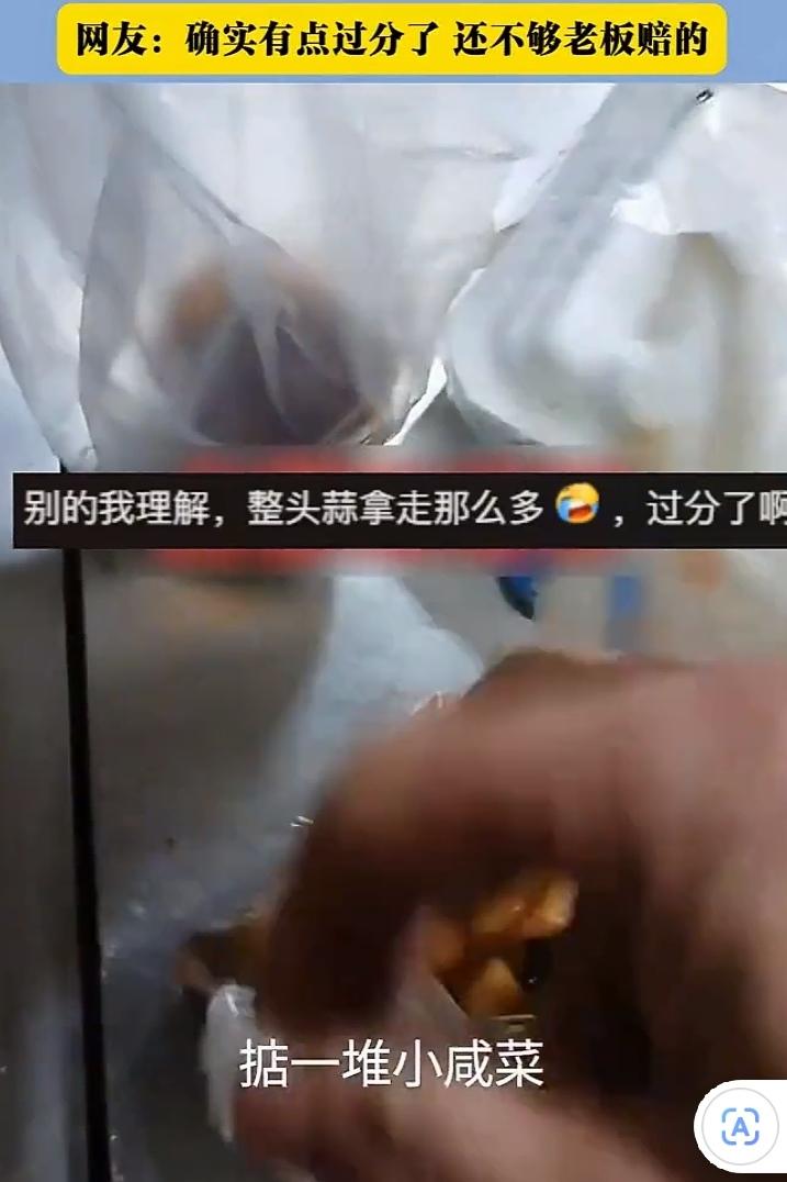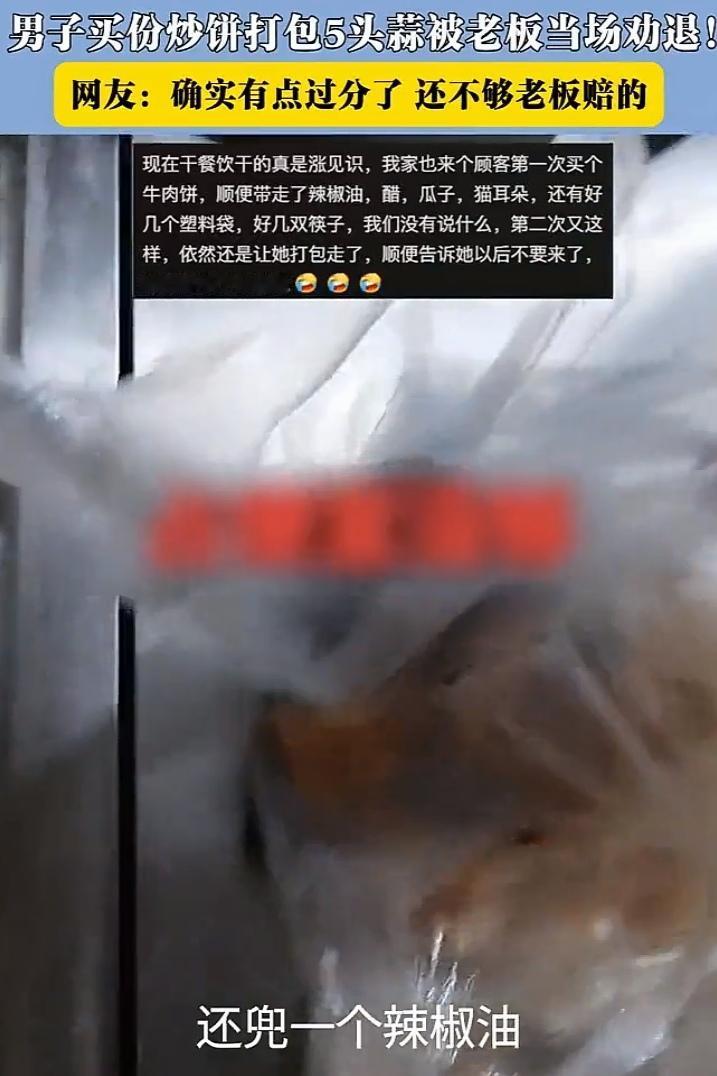 天津,一个大哥买炒饼打包,顺手拿了5头蒜、一整瓶辣椒油,还有一堆咸菜,老板看见后直接摆手:“你走吧,这炒饼我不卖你了!” 这位大哥到小吃店买炒饼,付完钱后就开始装免费配料,大蒜一拿就是5头,辣椒油直接拧走一整瓶,咸菜也夹了满满一大份。 小吃店本就是小本生意,利润微薄,这些配料虽说免费供顾客搭配着吃,但这么个拿法,明显超出了正常食用的范围。 老板实在扛不住,只好开口劝退,这事传到网上,网友们也各有想法,有人说老板不容易,小本买卖经不起这么霍霍,也有人说北方吃饼配蒜是常态,5头蒜不值啥钱。 真是大千世界无奇不有,就为了几样配料,居然连炒饼都没买成,你说这事怪谁呢?