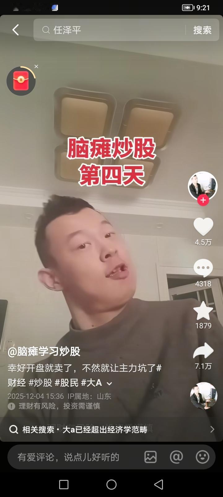 这几天炒股的那些博主都要崩溃了,一位得脑瘫的人来炒股,他炒股12天,基本天天在赚,偶尔绿,也只是亏100多,但赚的时候是上千块的次数多,有人算过他12天赚了6000多。如果你们去看他的视频,那你们绝对得道心崩溃。现在网上不少讲炒股的博主都崩溃了,以前电视就讲炒股是反人类的,如今看来的确如此,正常人去炒股的基本都是亏的。一个脑瘫以不正常的角度去买,他反而比正常人要赚的多。如果想炒股赚钱,不妨先去问问有没有可以得脑瘫的药,先把自己给治成脑瘫了,也许能在股市里捞一把。(图片信息来源:脑瘫学习炒股)买炒股 炒股人发疯 股市修行者 投资人在炒股 小伙炒股 炒股专家 普通人炒股