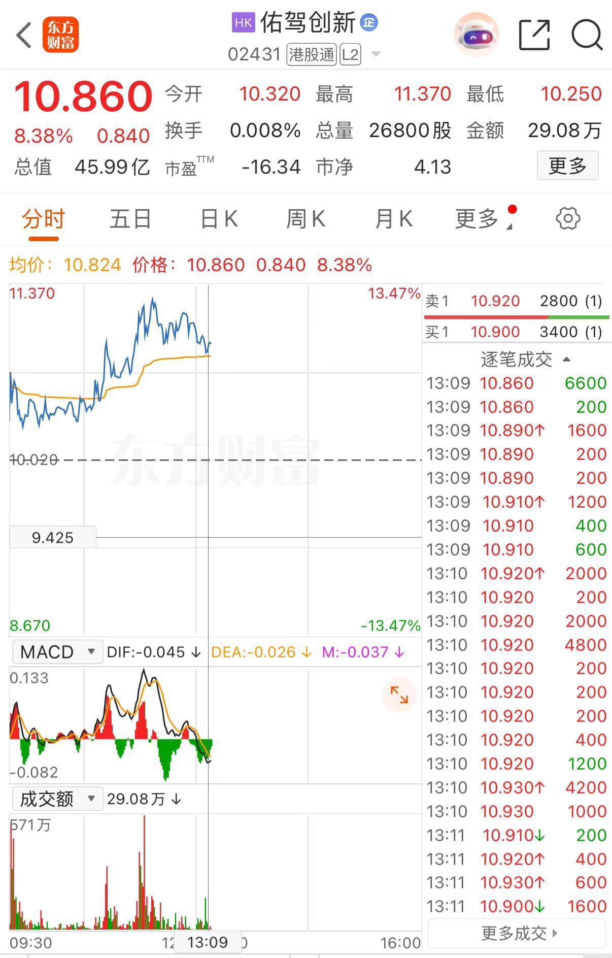 上证报中国证券网讯(林铭溱记者孔令仪)12月16日,佑驾创新震荡走高,盘中一度涨超13%,最高报11.37港元/股。截至13时09分,佑驾创新涨8.38%,报10.86港元/股。