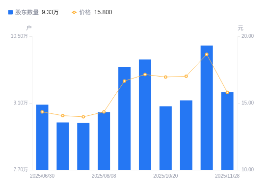 日期A股户数(户)流通A股户均持股数(股)户均持股市值(万元)2025-12-10918716316.999.612025-11-28932716222.189.832025-11-201030585631.2810.502025-10-31915586338.5910.782025-10-20903206425.4710.892025-09-301001435795.209.932025-09-19985525888.759.802025-08-08891296511.339.342025-07-31868406682.969.342025-07-18869396675.359.39