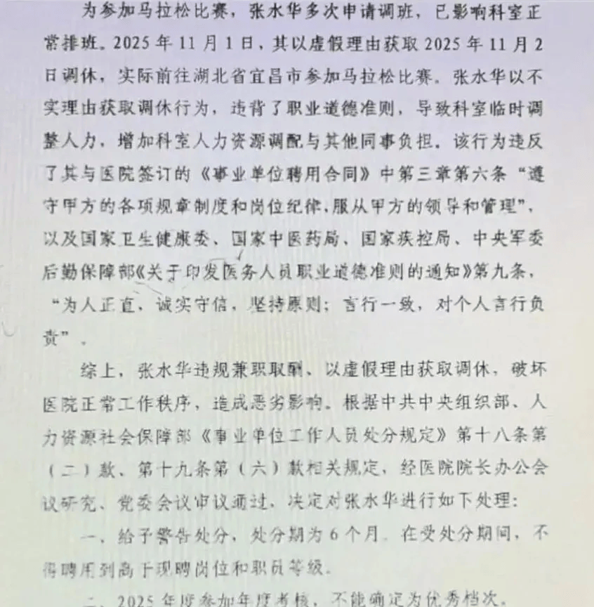12月9日,有网友公开的一份医院内部处理决定称,张水华因违规兼职取酬、以虚假理由获取调休,被处以警告处分6个月,并取消2025年度评优资格。12月10日,该医院官网发布情况说明,重申“在遵纪守法、不影响本职工作的前提下,鼓励员工发展个人兴趣爱好”。此后,张水华清空了社交账号的作品,并放弃了福州马拉松赛事。这再次在网上引起热烈讨论。