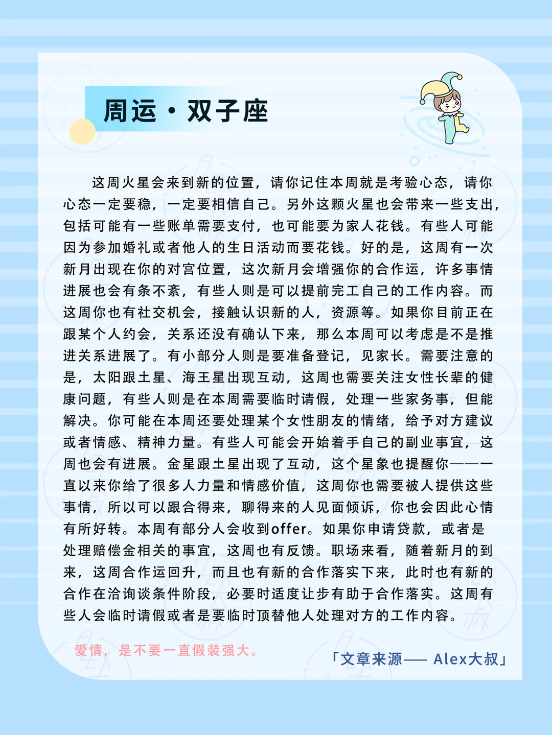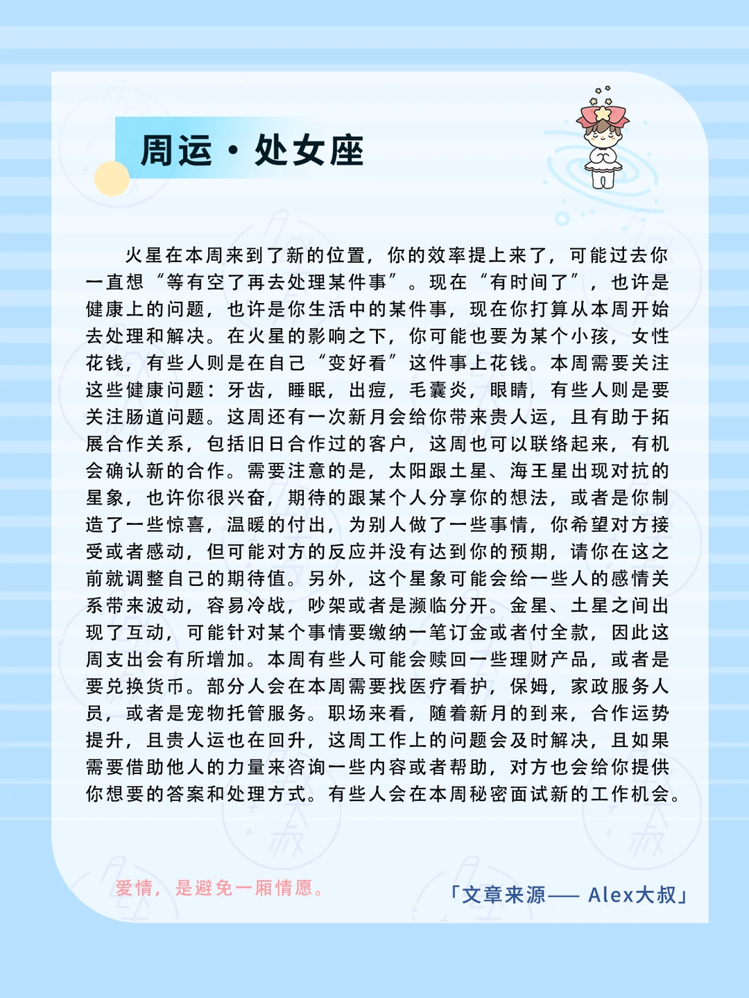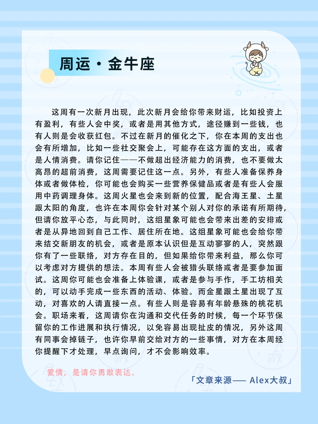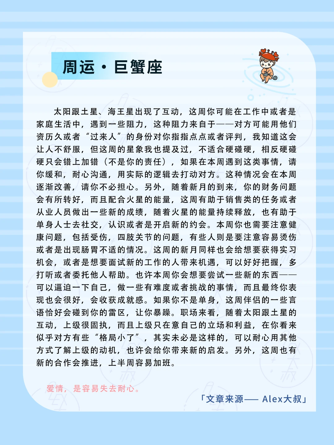 如果你目前已经跟某个人在相处,互动上出现问题一段时间了,或者是你单方面已经不愉快了,那么本周的星象会加剧这种不舒适——但其实星象是在引导你表达自己的感受,以及让自己意识到如果长时间处在不健康的相处关系里对自己的危害,因此针对这周发生的事件甚至是争吵,可能会帮助你在这样的关系里做出决定和改变。