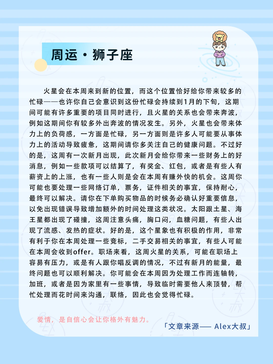 这组星象也可能会带来一些限制,比如被告知——不允许做哪些事,不批准哪些事情等等,但是有转机,可以据理力争一下,但是表达方式避免硬碰硬,因为本周星象不仅容易让自己冲动,也会因为强化个人意志、地位、权势而做出不理智的决定,比如明知道你说得有道理,但你的表达方式让对方不舒服或者是觉得让对方没有面子,所以宁愿将错就错,因此表达方式和尺度很关键。
